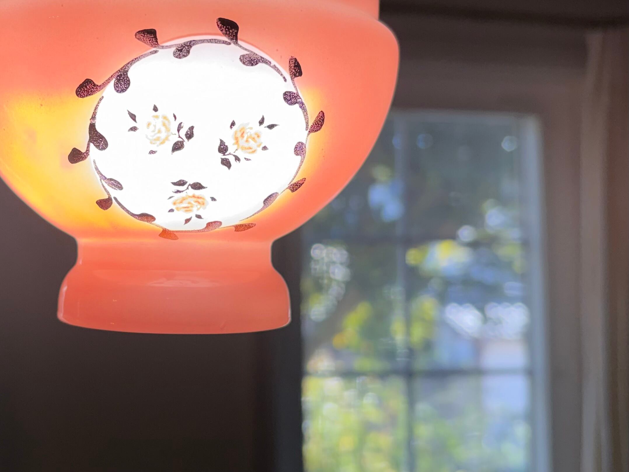 こちらのシェードは古いガラスにピンクと小花が絵が描かれた可愛い雰囲気です。