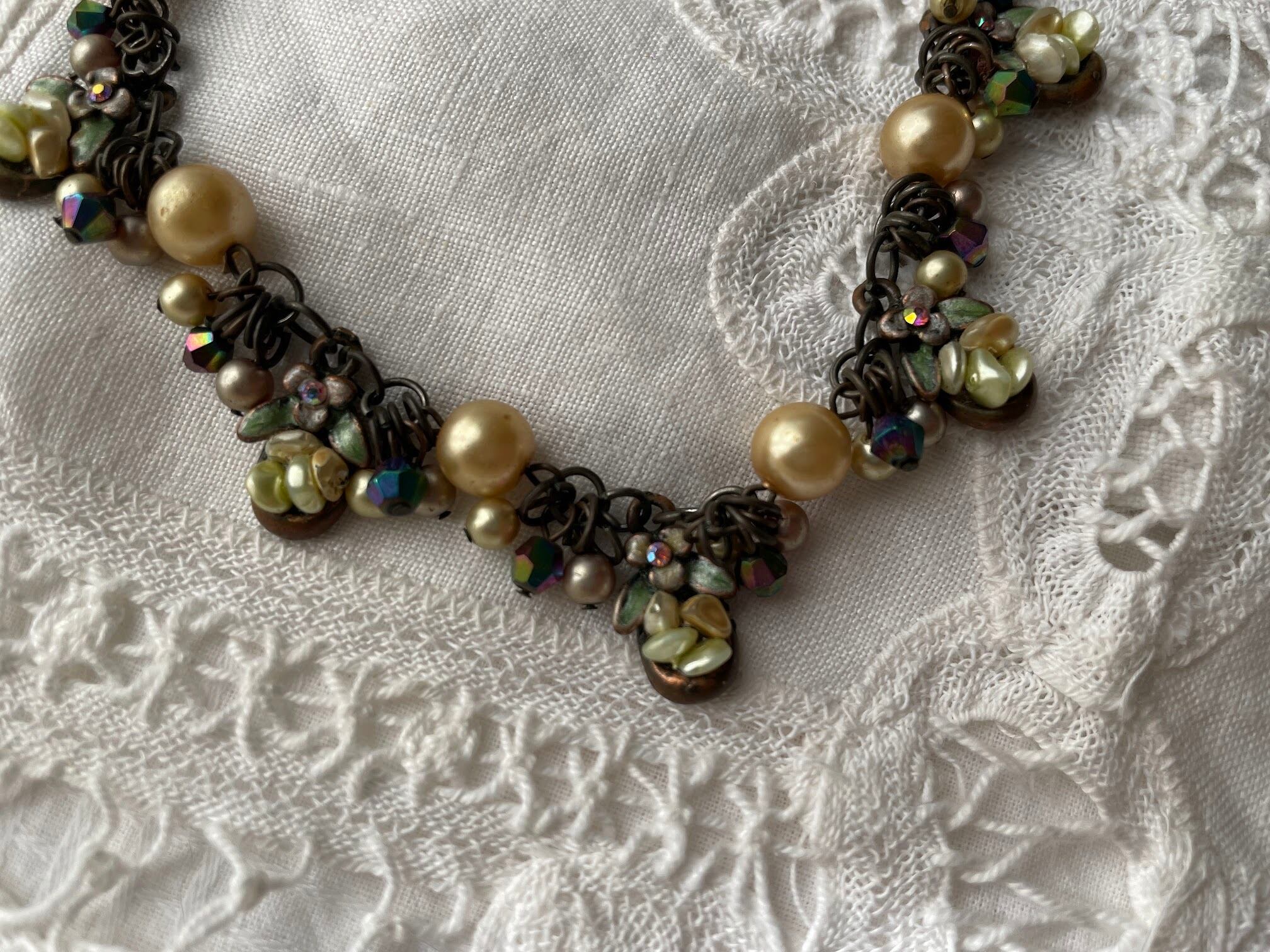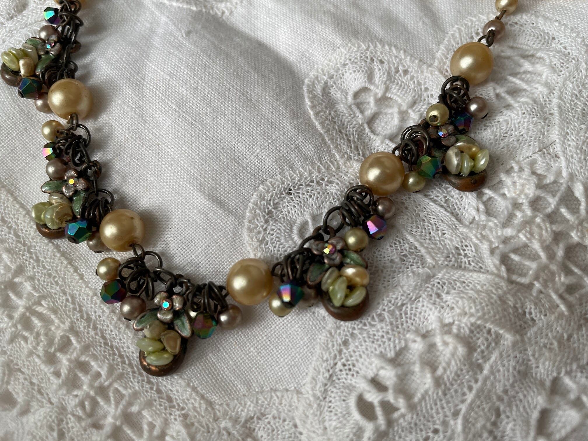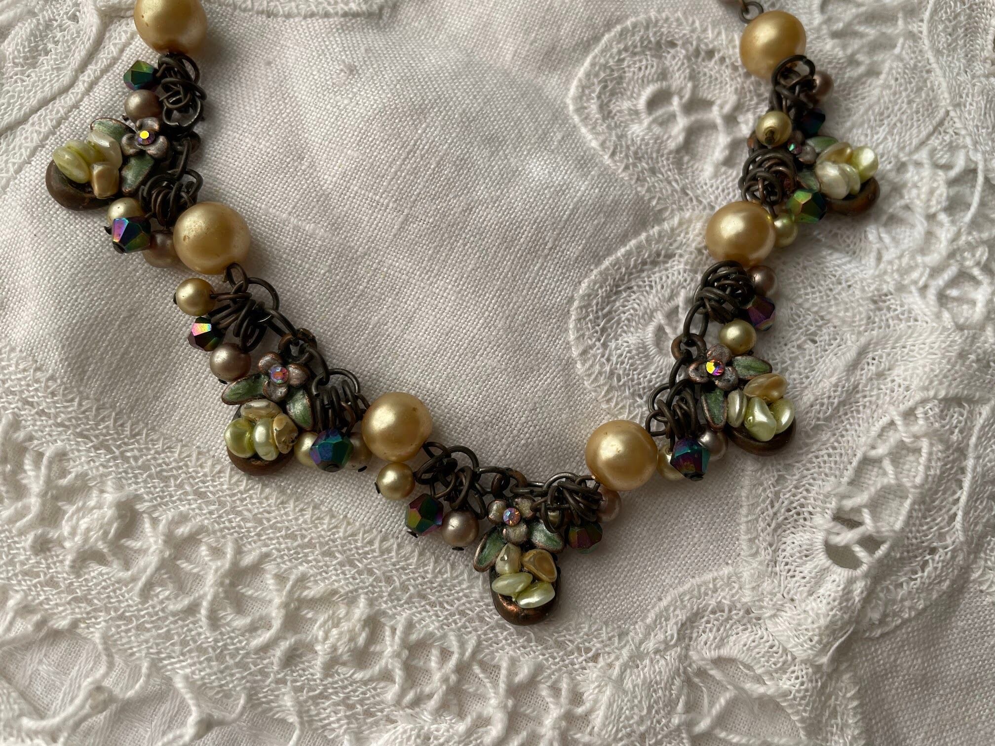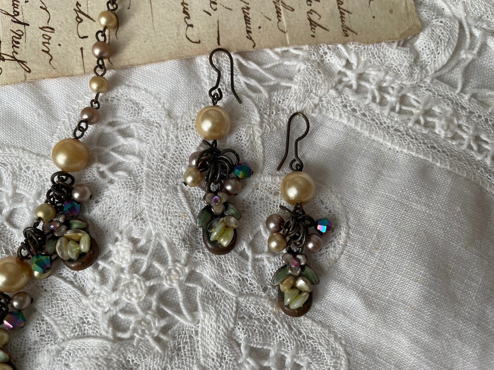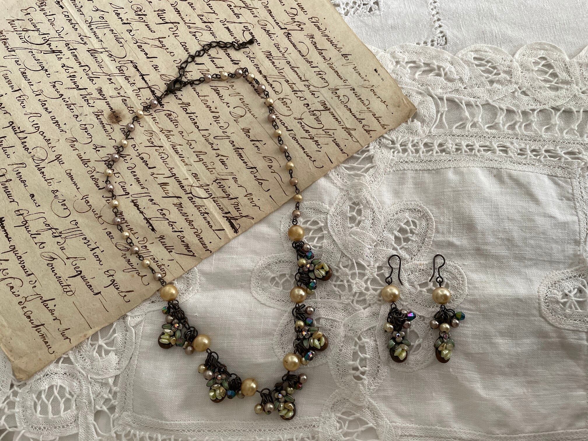 フランスから届きました。ニュアンスカラーの花モチーフとパール、ガラスビーズなどがレースのような形に繋がれたネックレスとピアスのセットです。