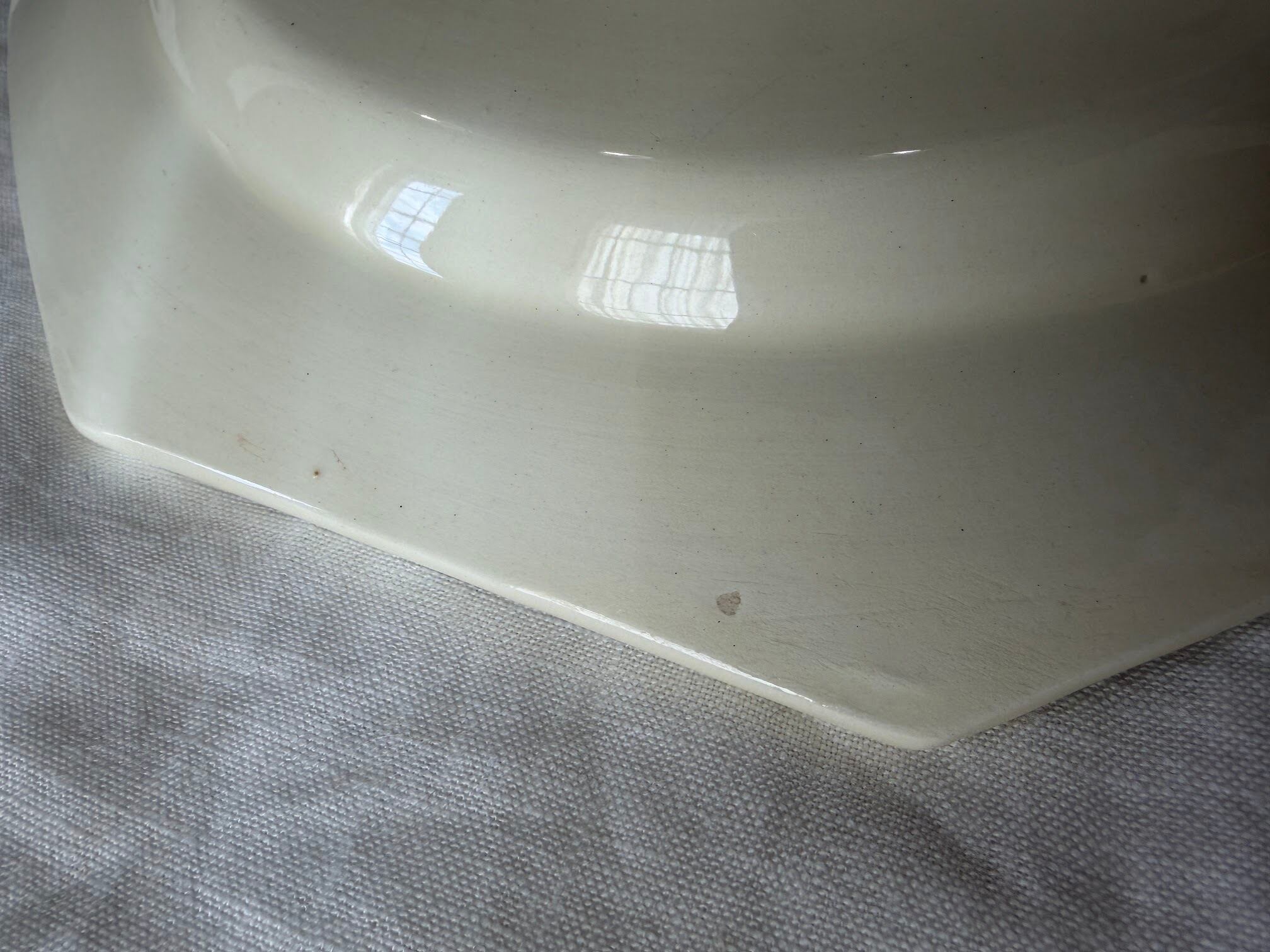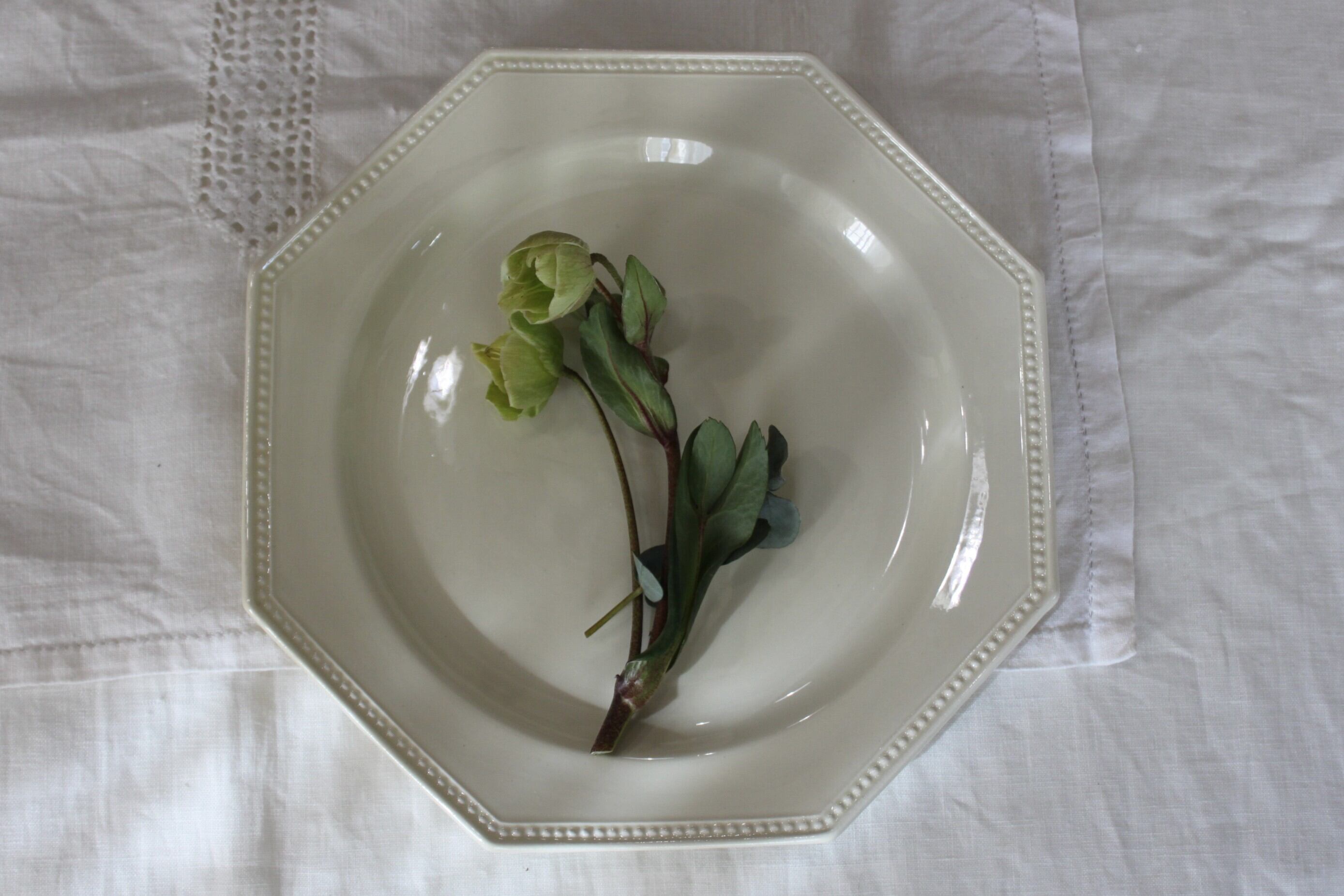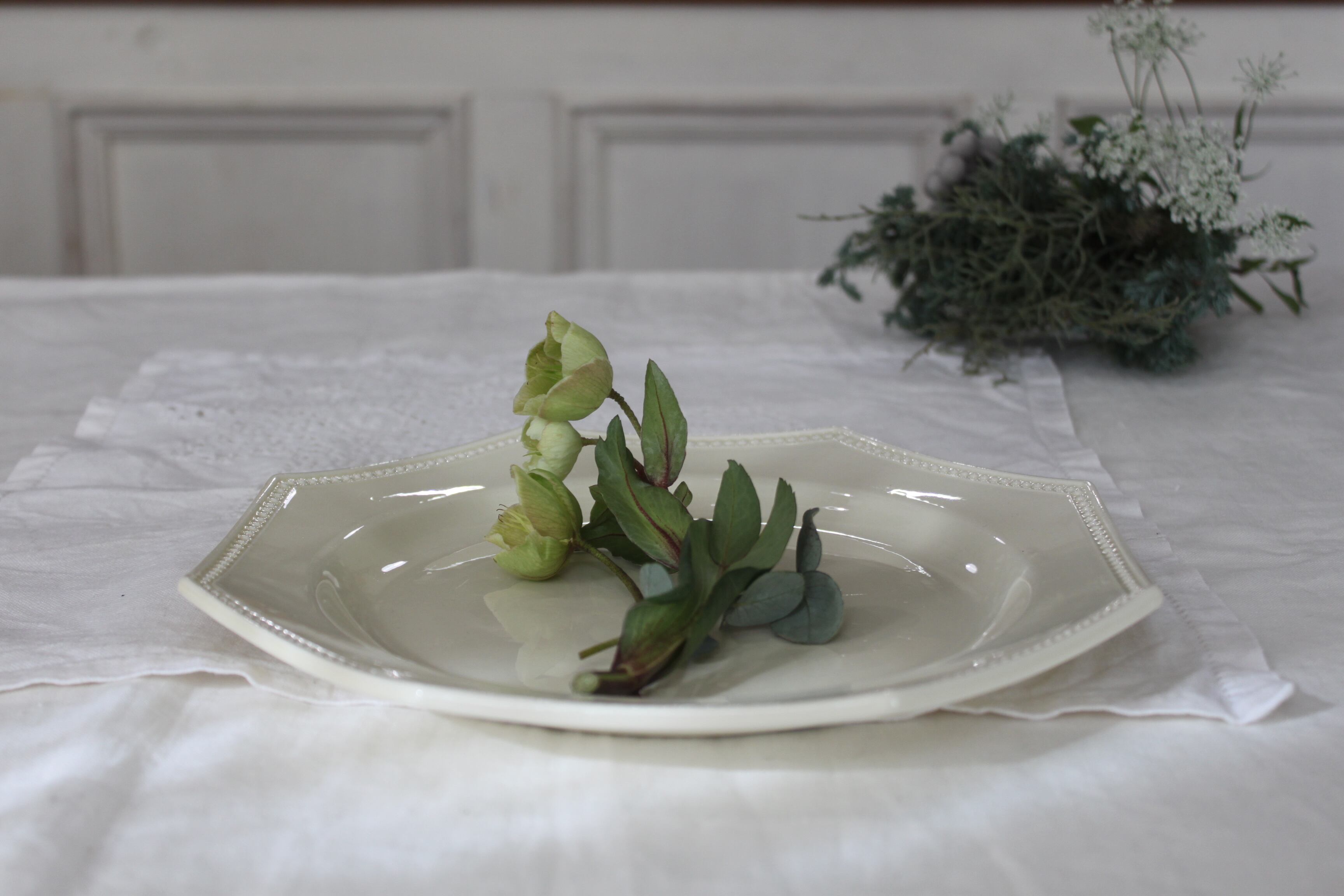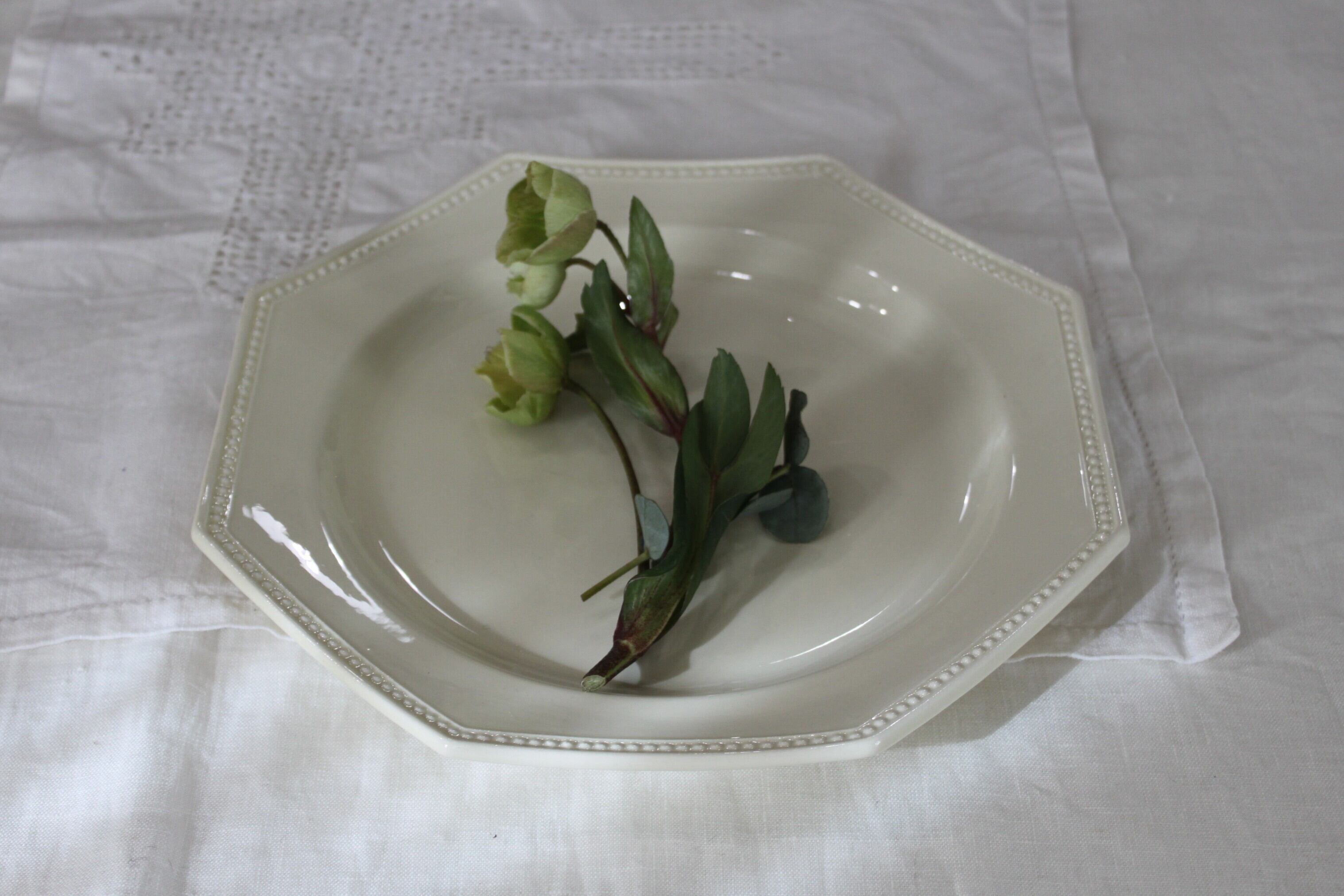 端正な八角形のフォルムが印象的で、凛とした佇まいの中にフランスらしい洗練を感じさせる一枚。余計な装飾を抑えたシンプルなデザインだからこそ、フォルムの美しさと白磁の柔らかな質感が際立ちます。