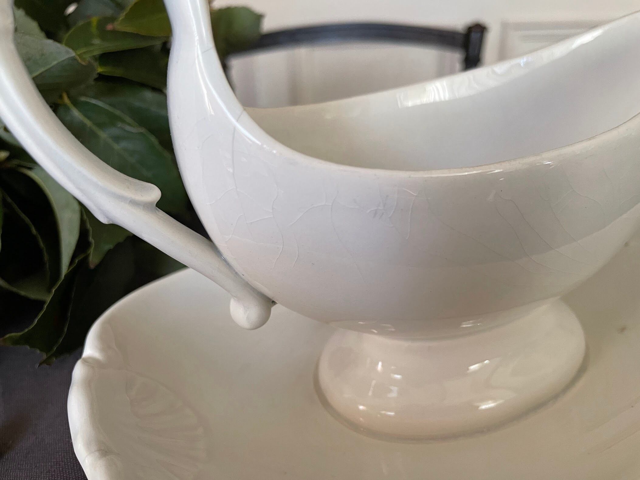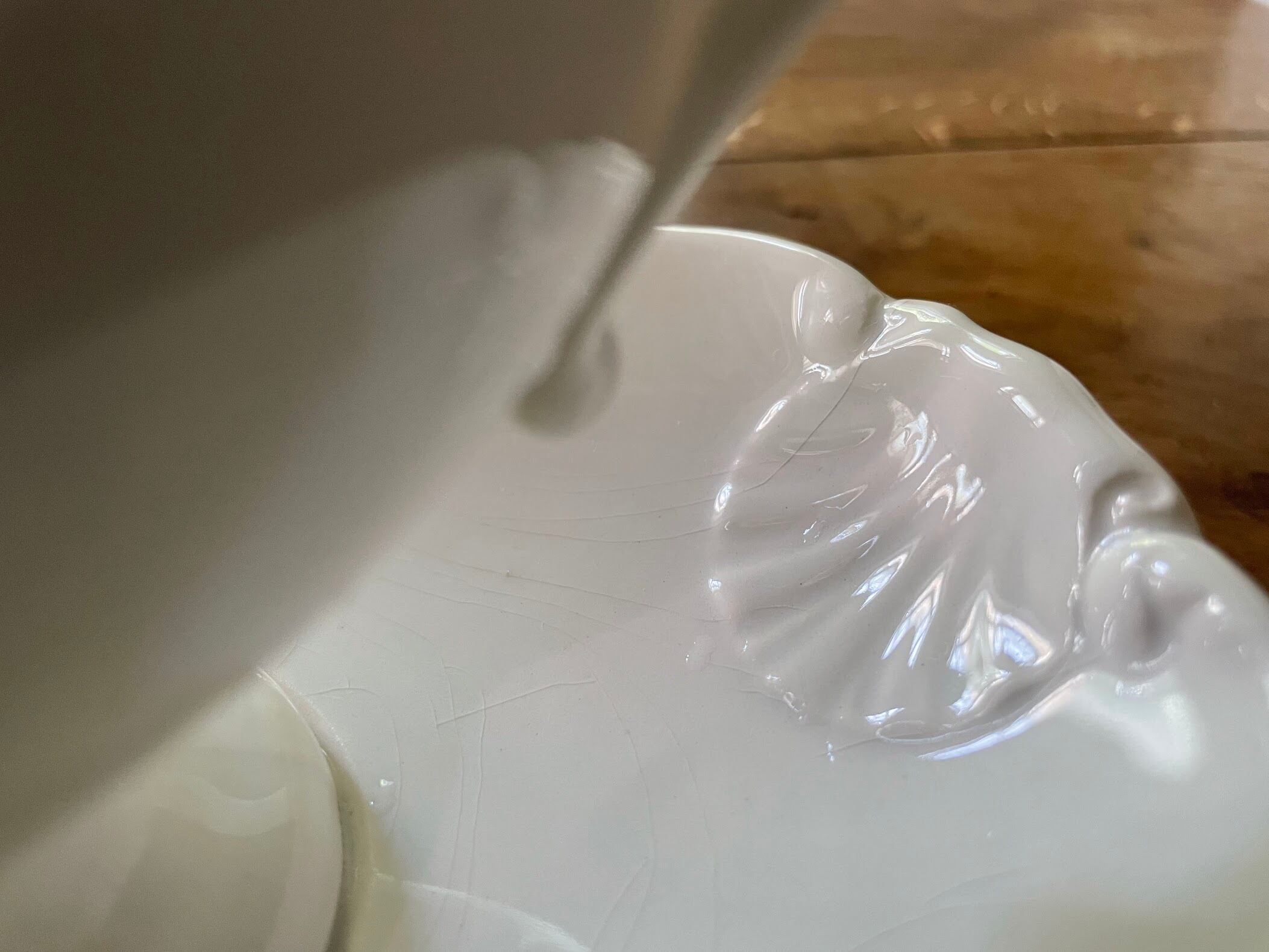 ※貫入多め、持ち手付近に1cmほどのヒビ、注ぎ口付近とロカイユモチーフにライン、ソーサー部分に2カ所釉薬ロス・小さなシミがあります。