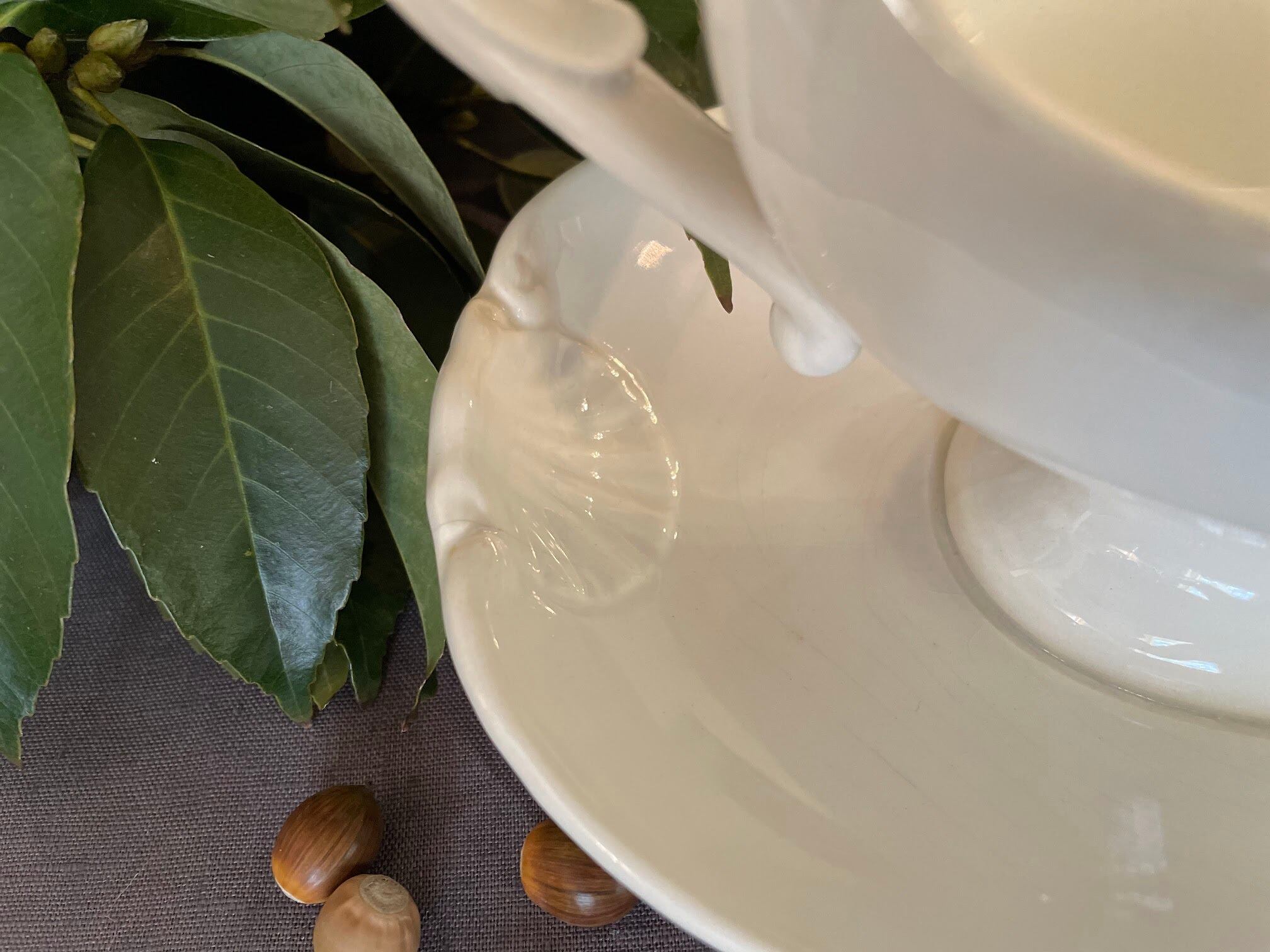 ソーサー部分にはロカイユモチーフが施され、全体に優雅で気品あふれる雰囲気を漂わせています。