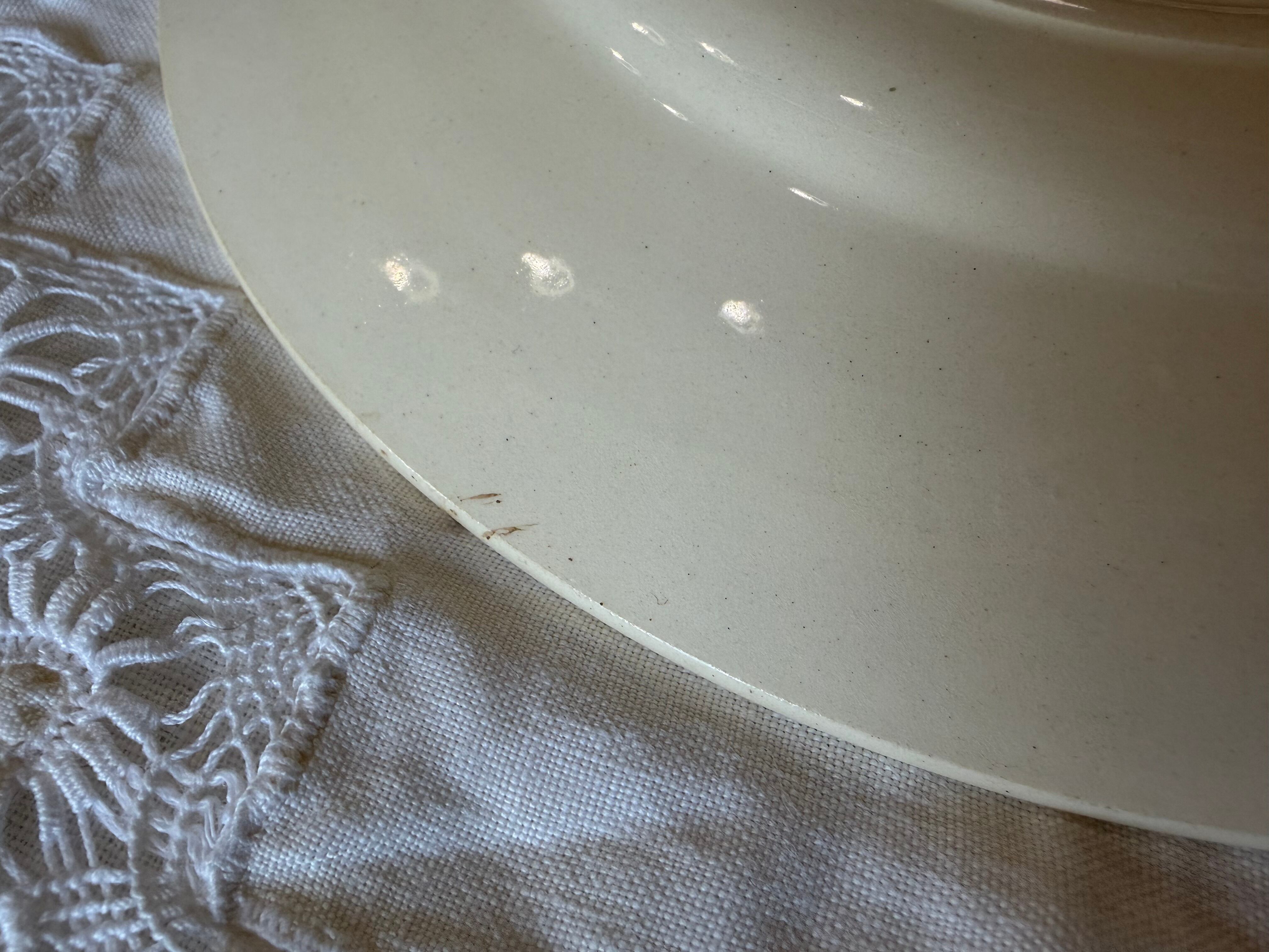 カトラリー傷、極小のチップ、裏側にひっかいたような窯キズがあります。