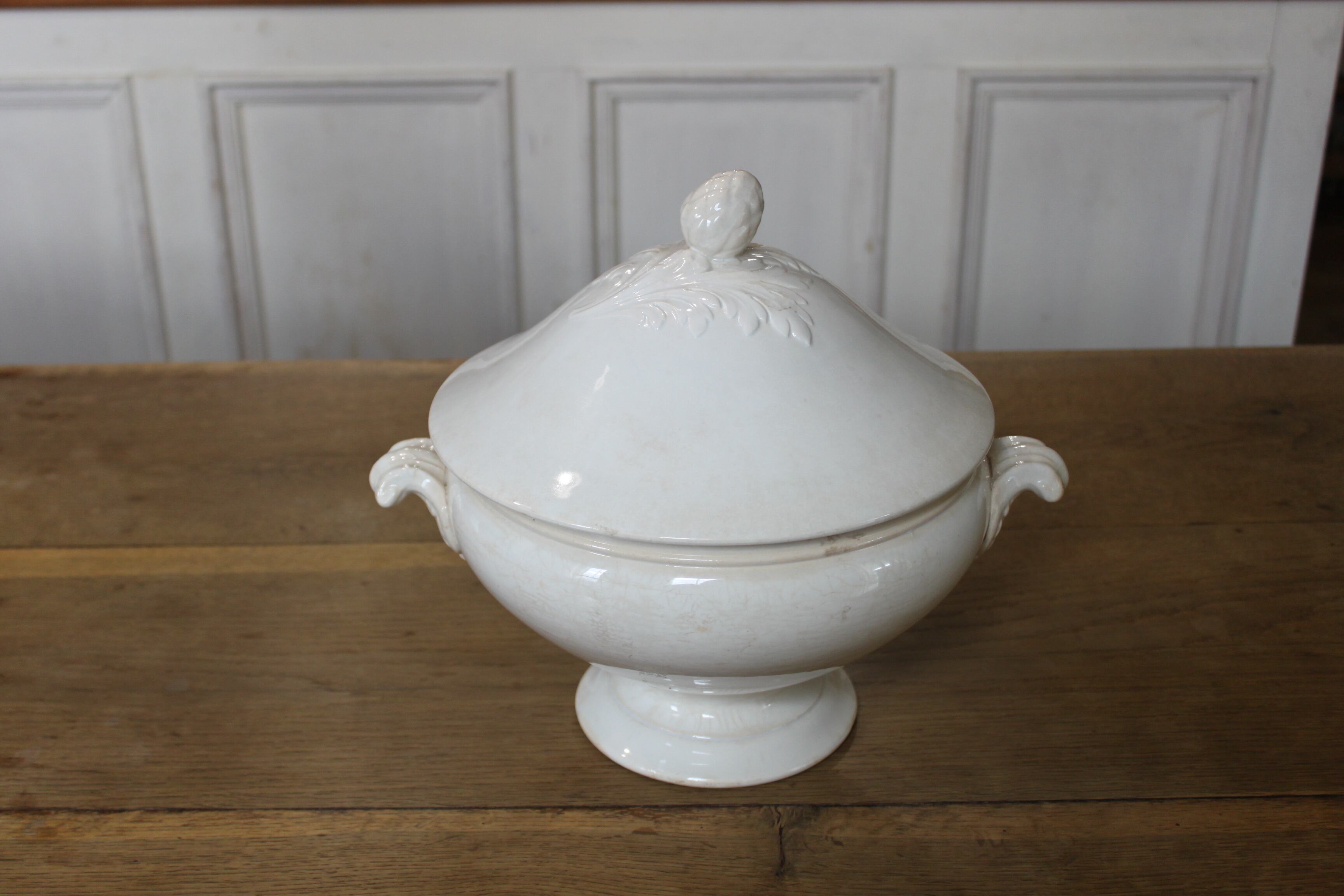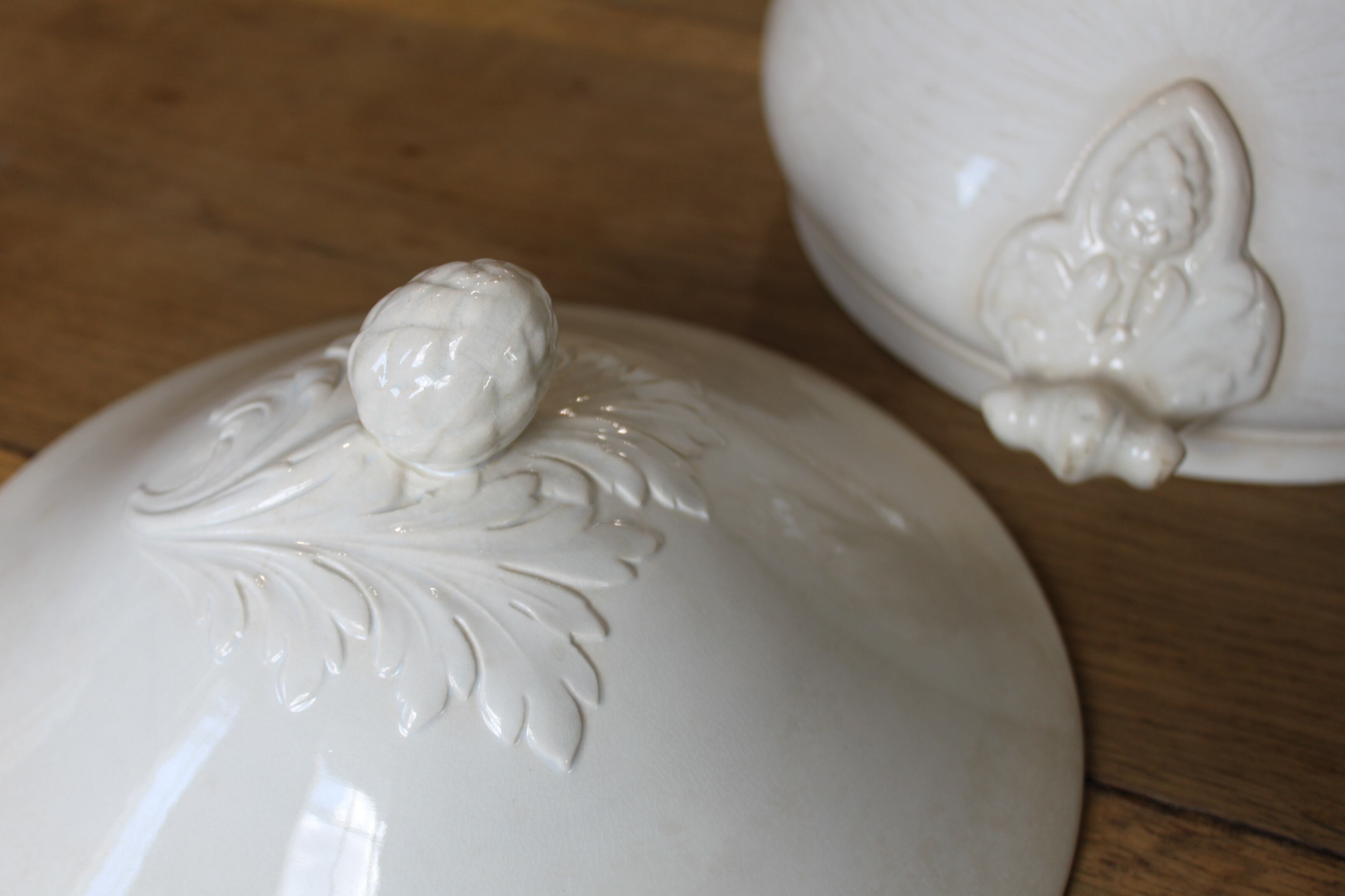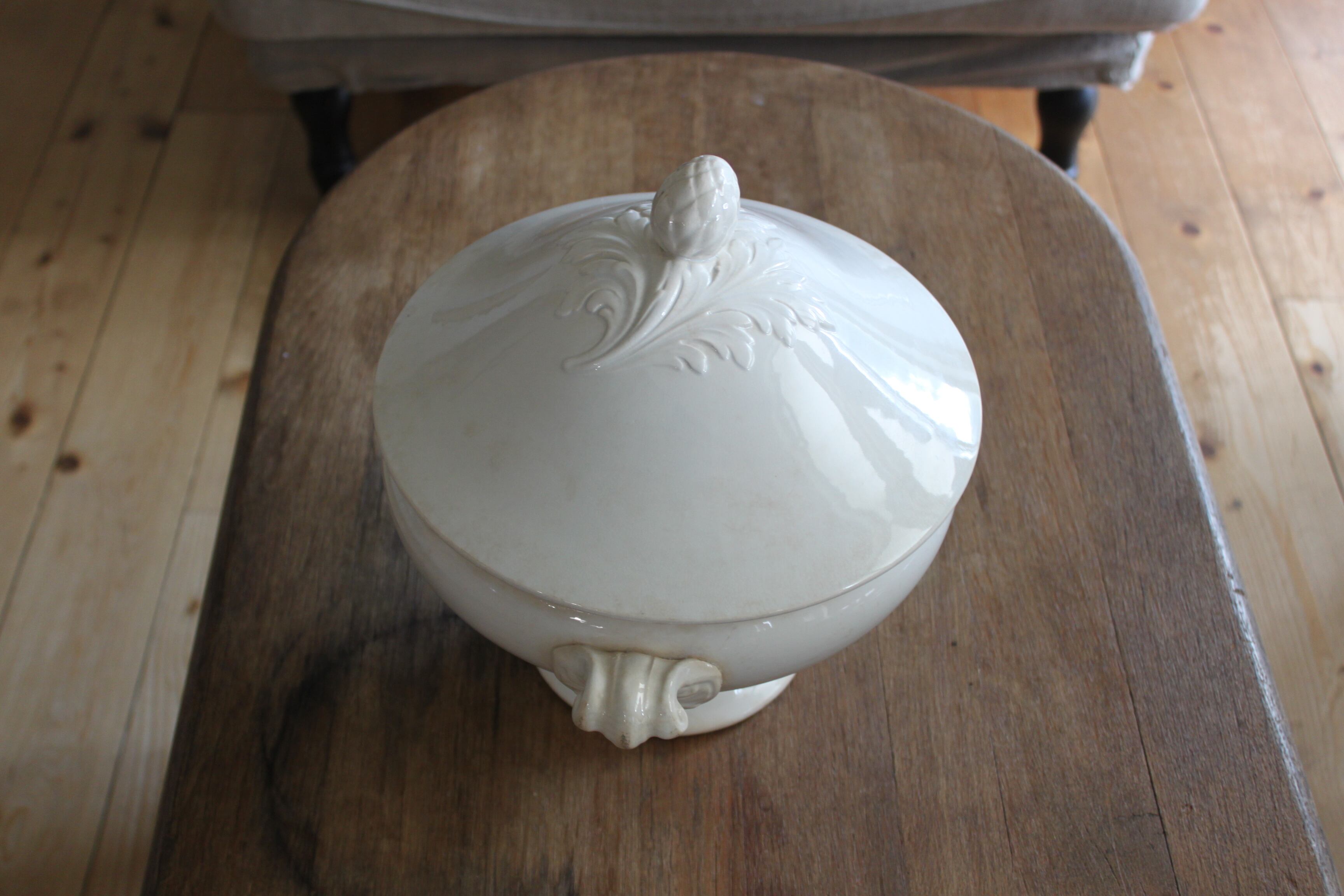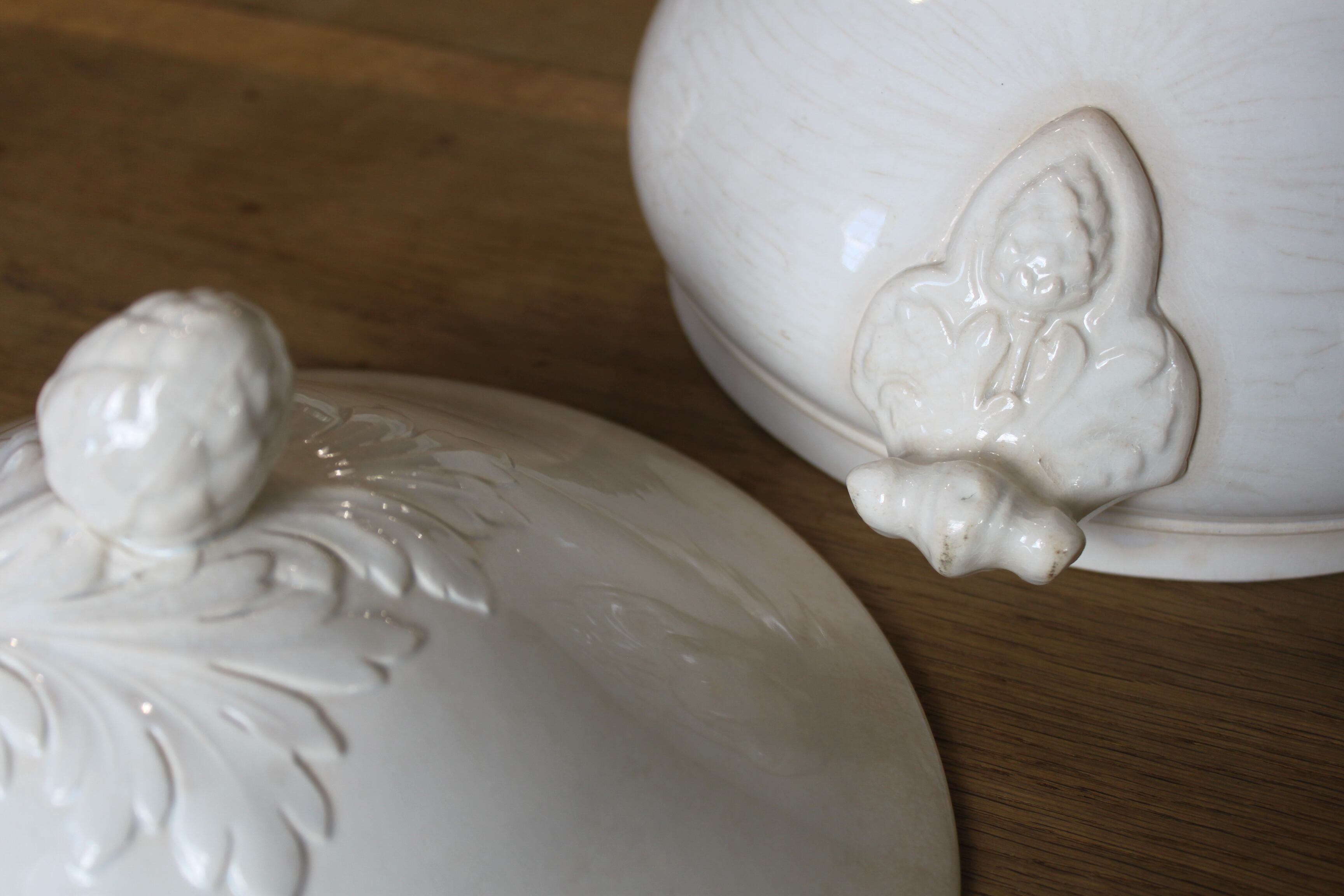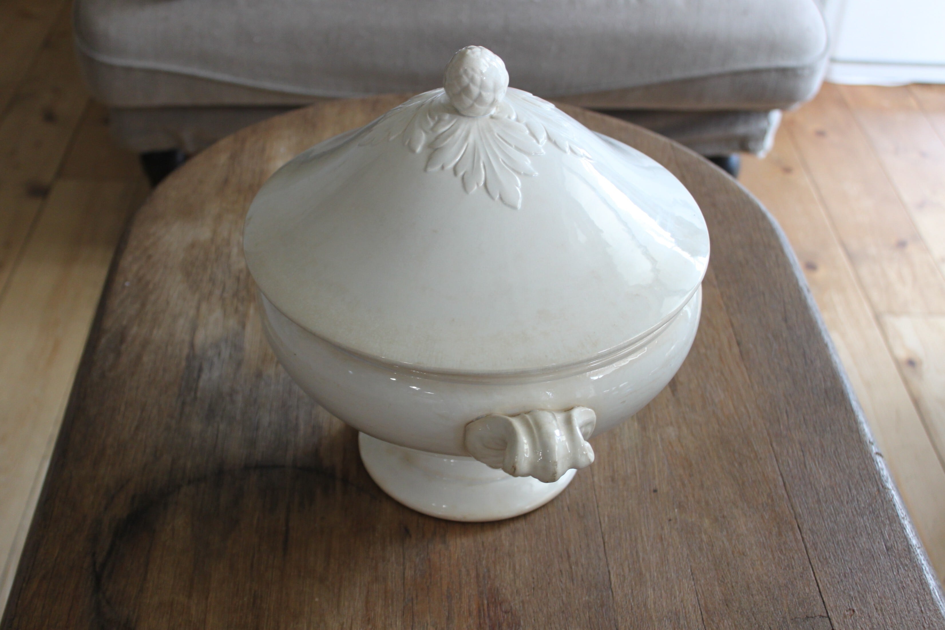 やわらかな白の陶肌に、蓋と持ち手にはアカンサスとアーティチョークモチーフのレリーフが施された、存在感のある美しい一品。