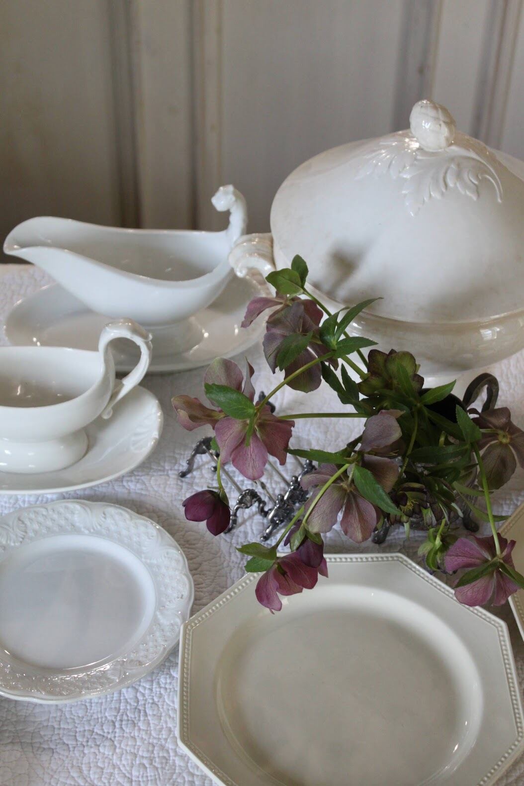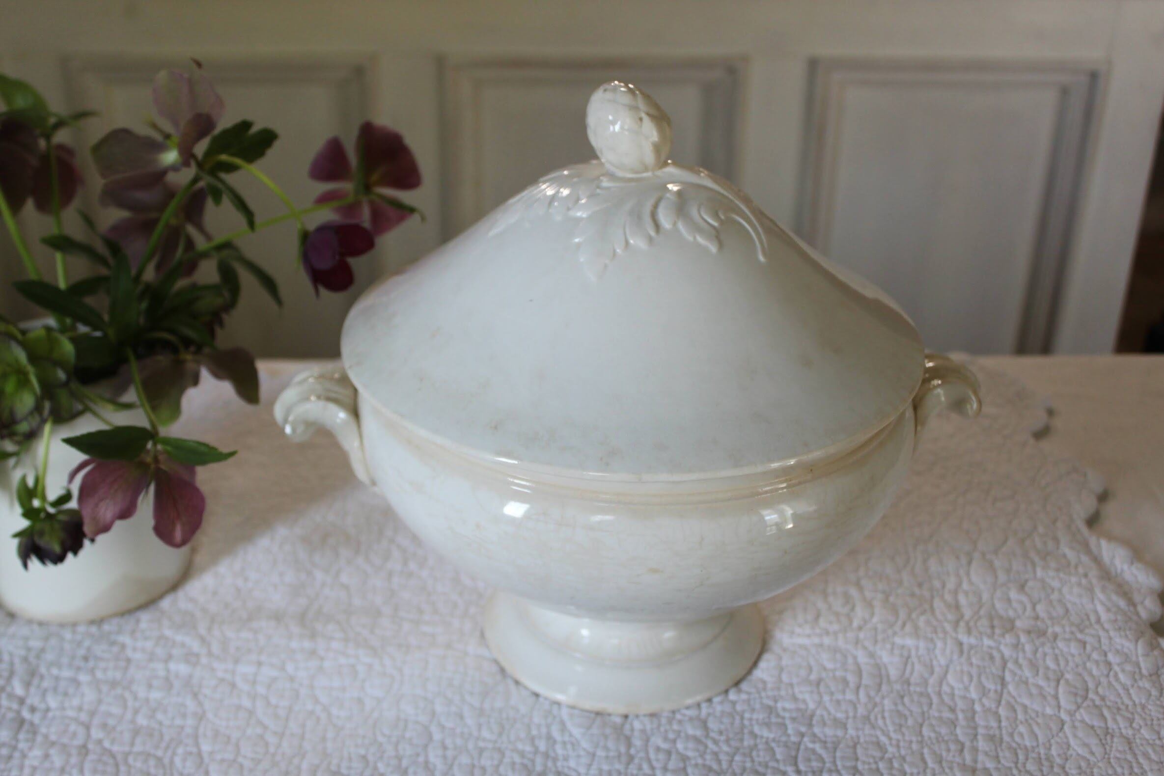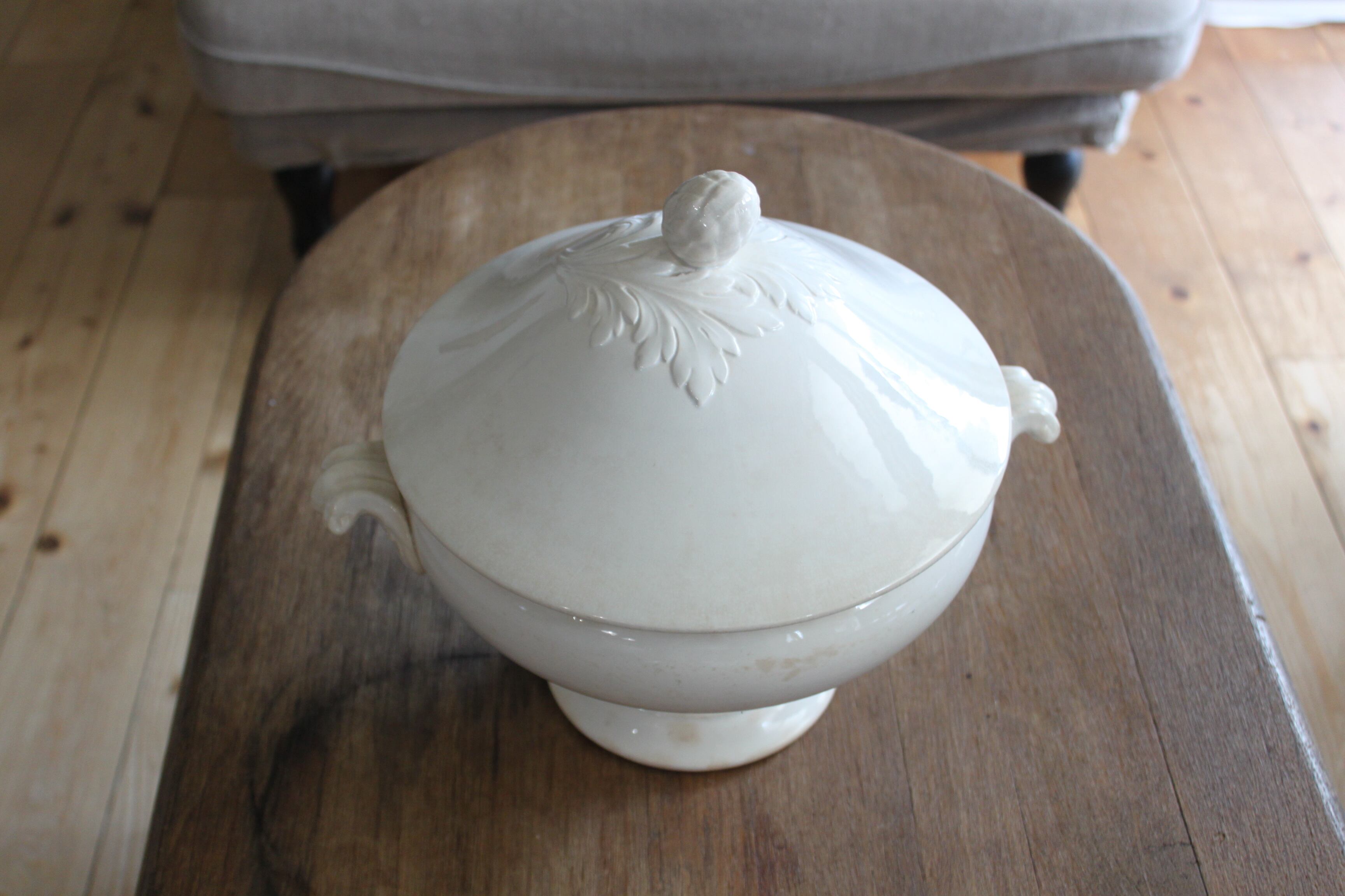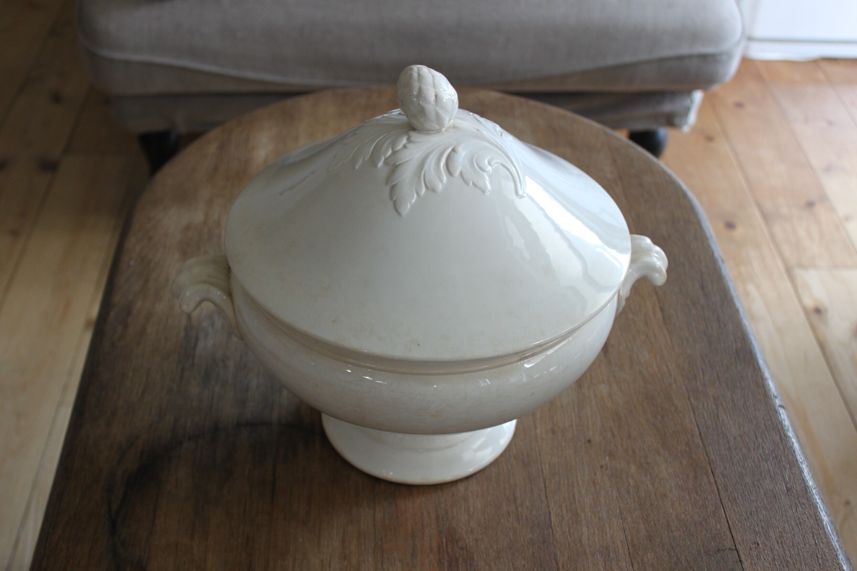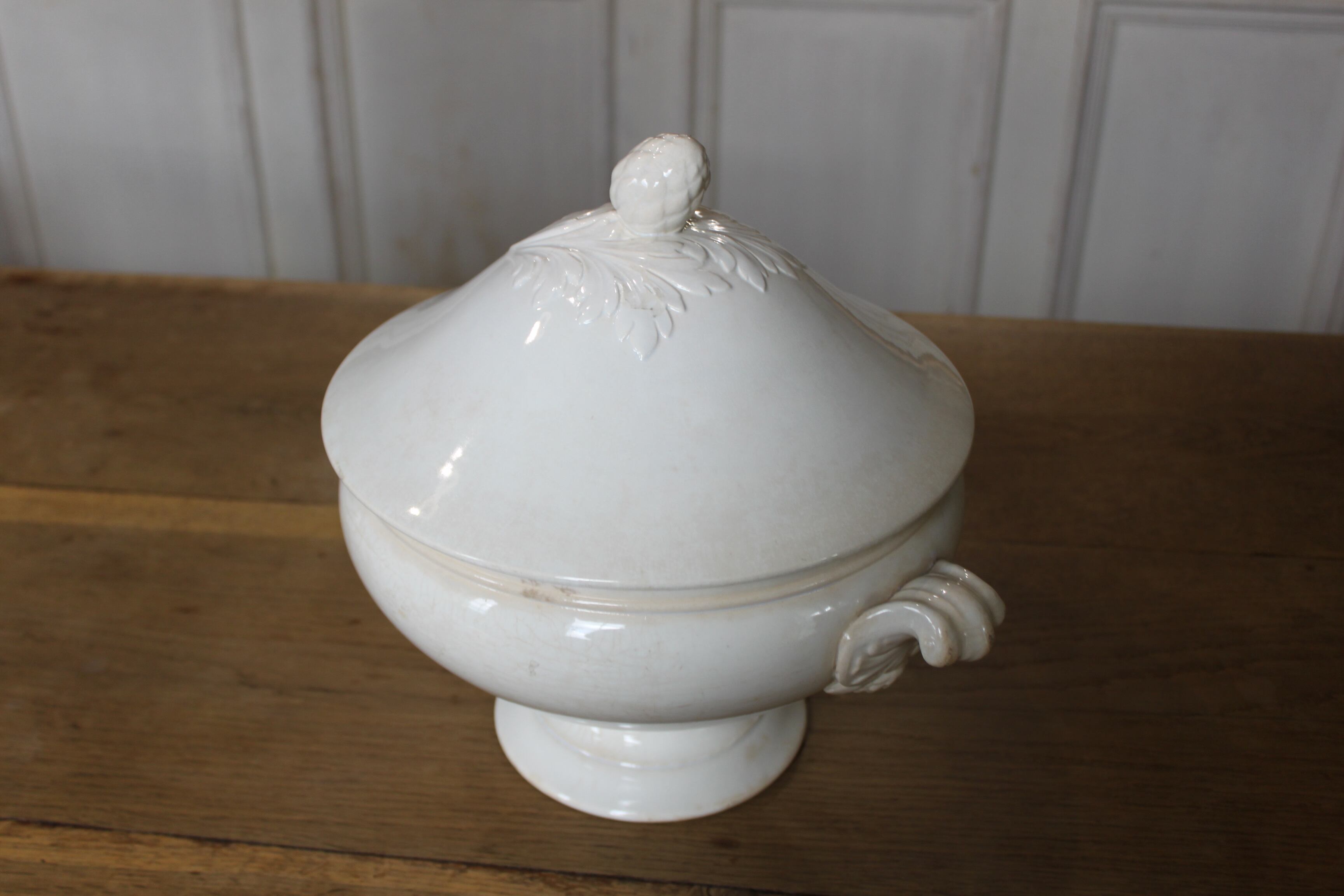 やわらかな白の陶肌に、蓋と持ち手にはアカンサスとアーティチョークモチーフのレリーフが施された、存在感のある美しい一品。