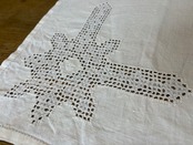 しっかりした麻布に丁寧に手刺繍されたハーダンガーのホワイトワーク。