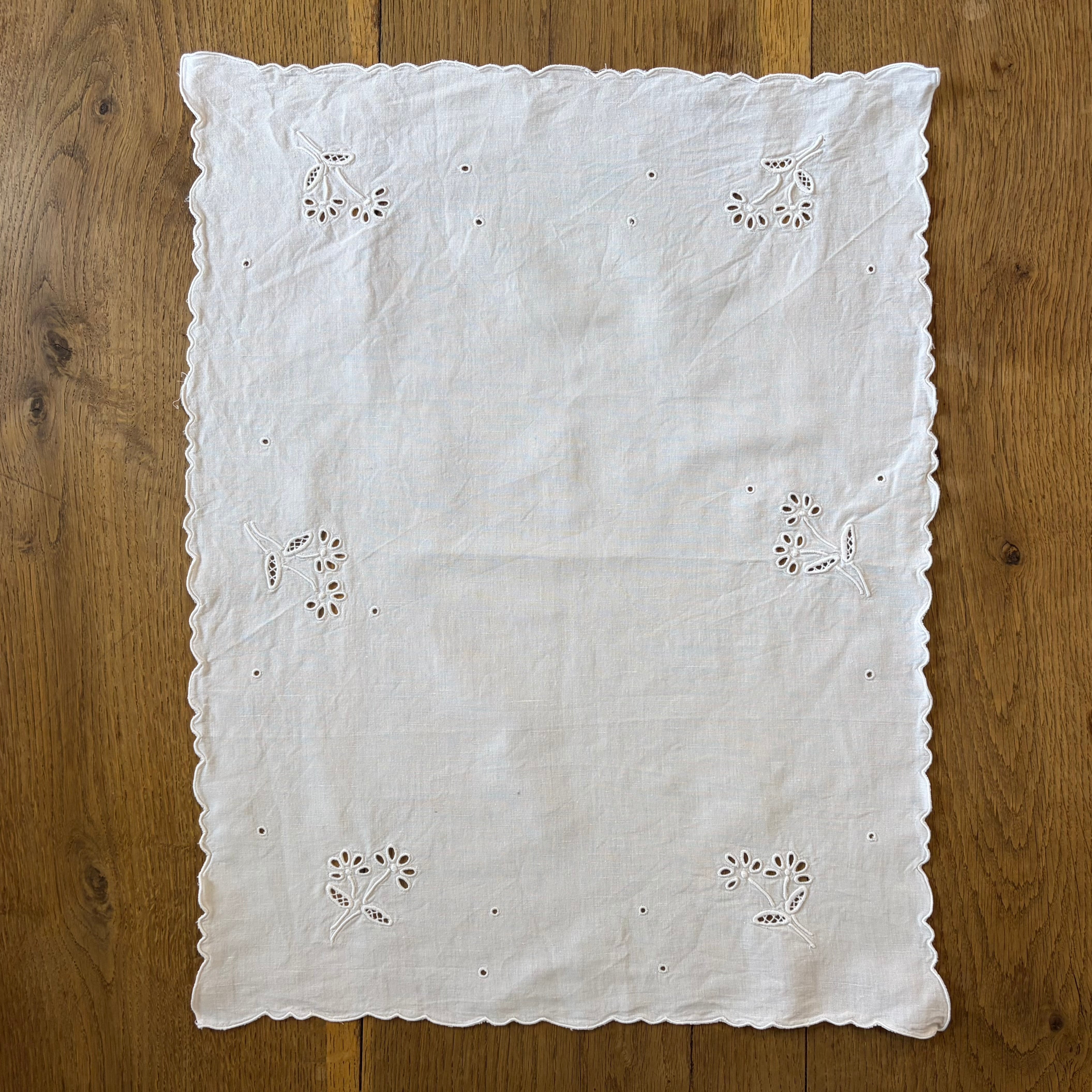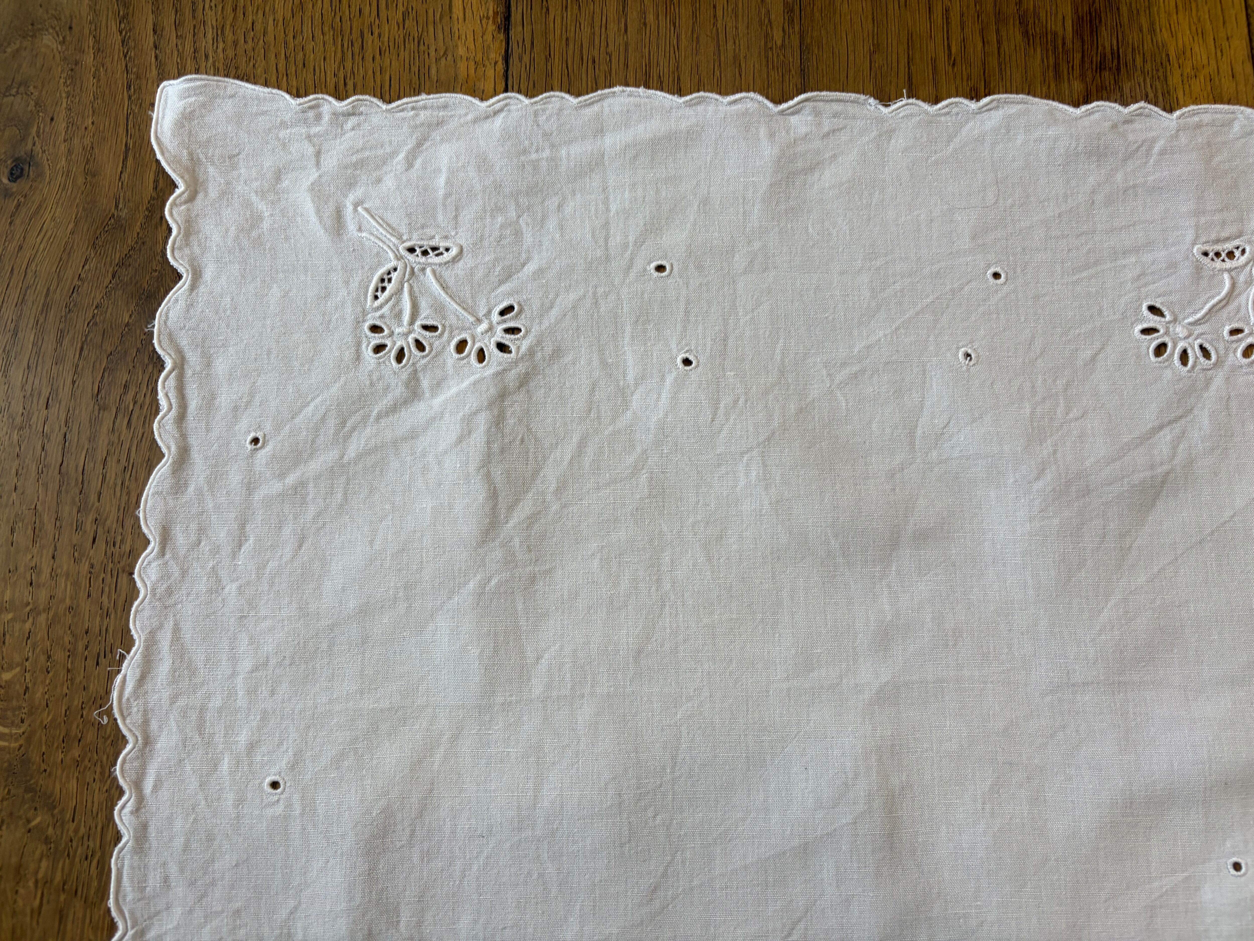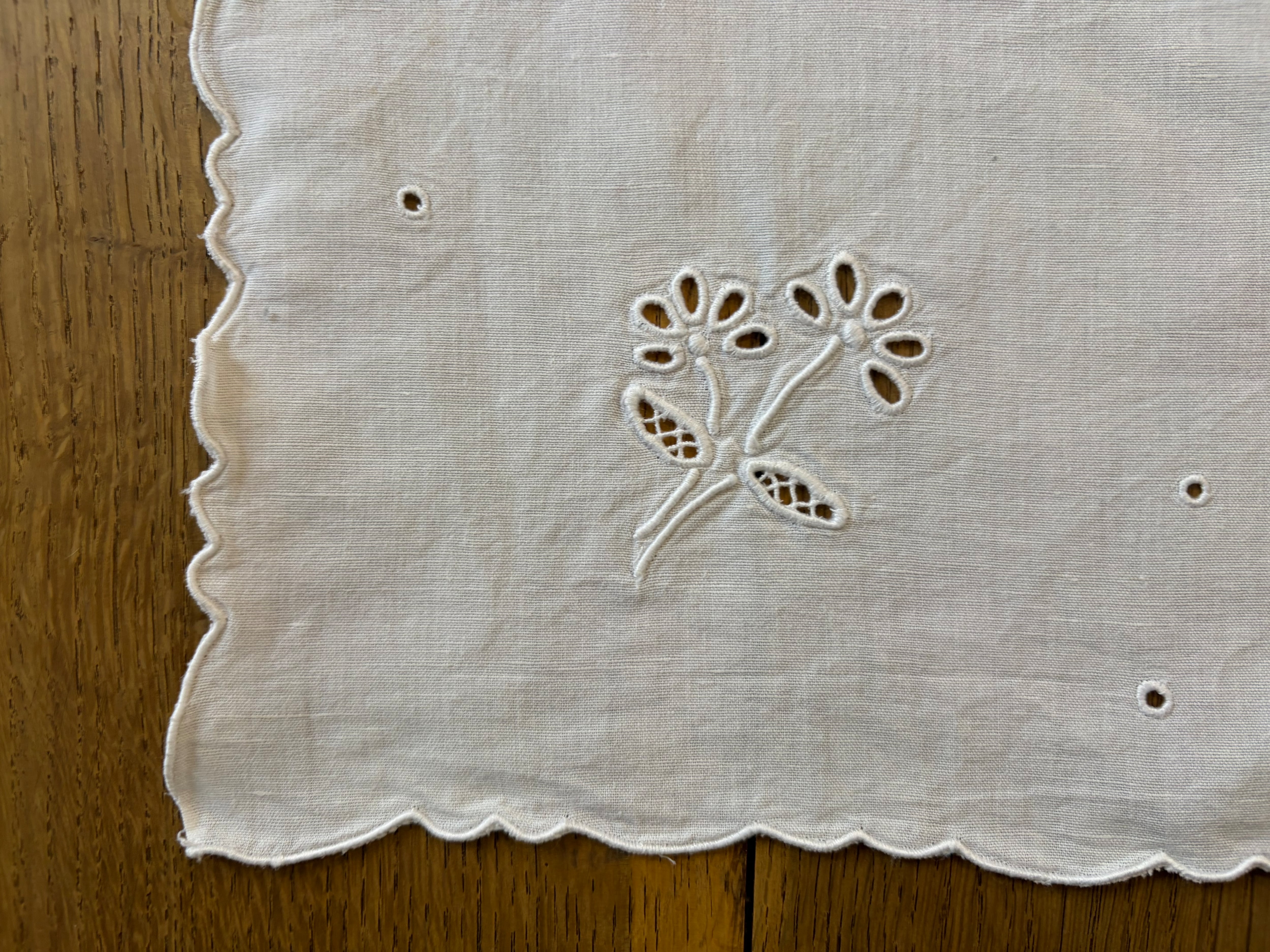 白い麻生地にカットワーク刺繡と白糸刺繡が施されたテーブルセンターです。