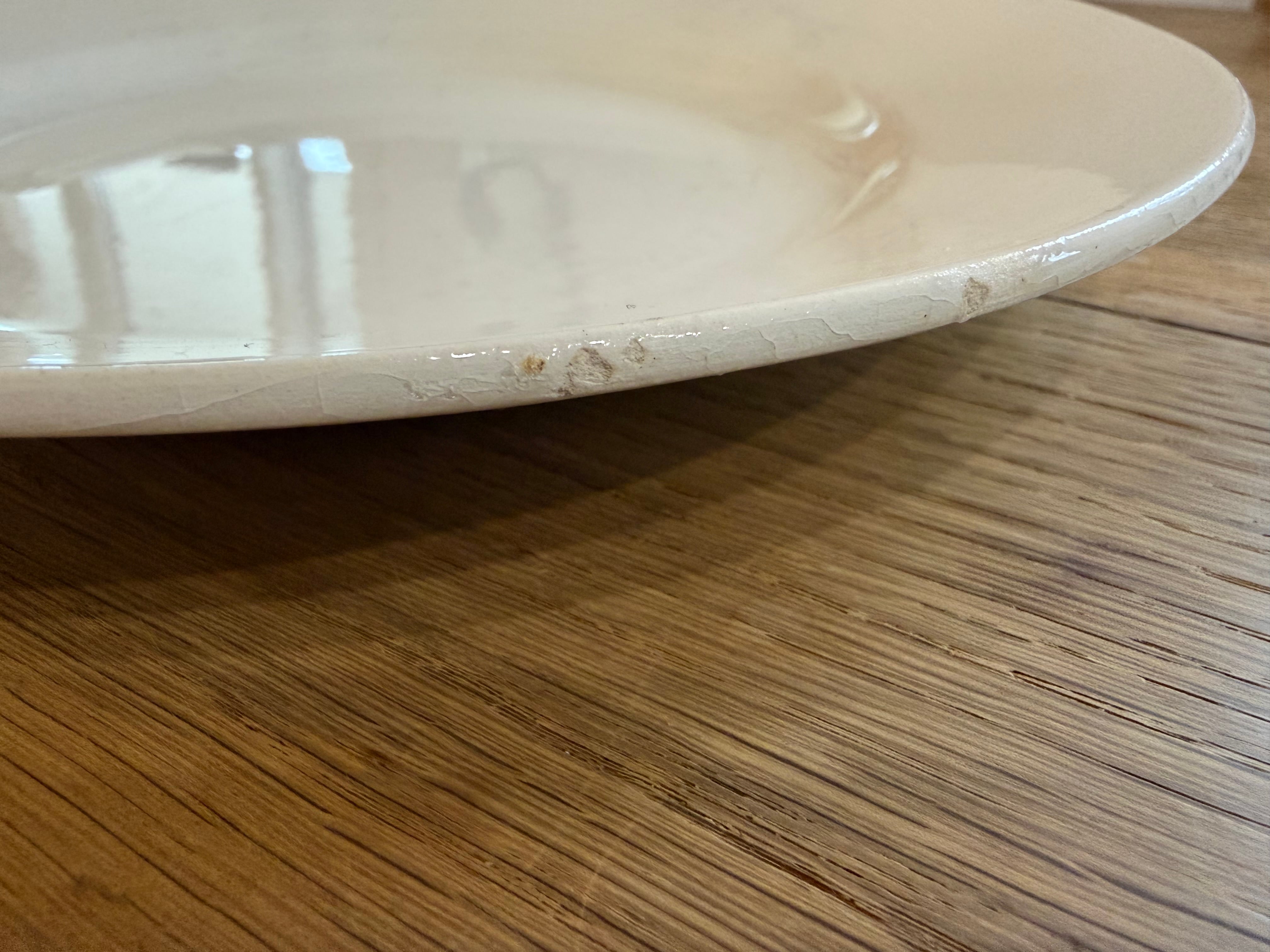 縁側面に薄く小さなチップが数か所、貫入多め、色付き、釉抜け、カトラリー傷があります。