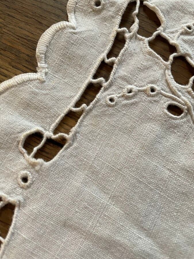 麻生地に手刺繡のカットワークが施されたドイリーです。