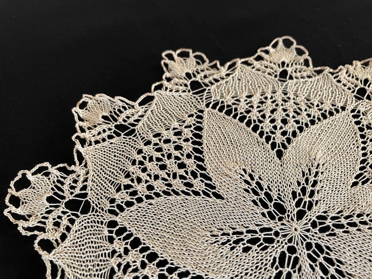 丸い形のドイリーはかぎ針で編むものが多いですが、こちらは棒針で編むクンストストリッケンレースドイリーです。