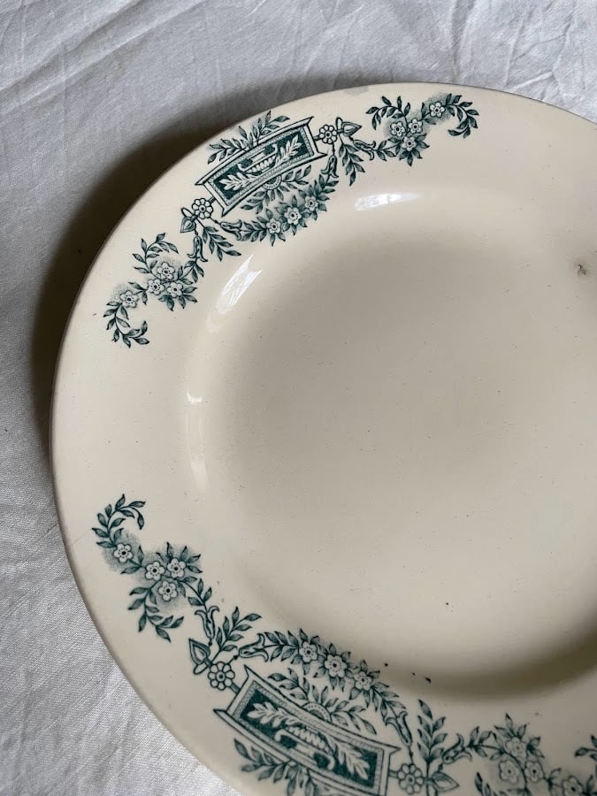 花のガーランドとエンブレムのような図柄がトラディショナルなイメージの、上品で美しいプレートです。