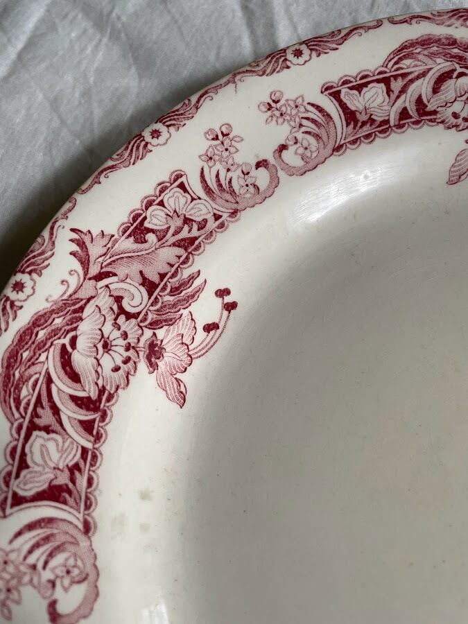 温かみのある象牙色の陶肌に深みのあるピンク色で描かれたロココな雰囲気の絵柄が華やかなアンティークプレートです。