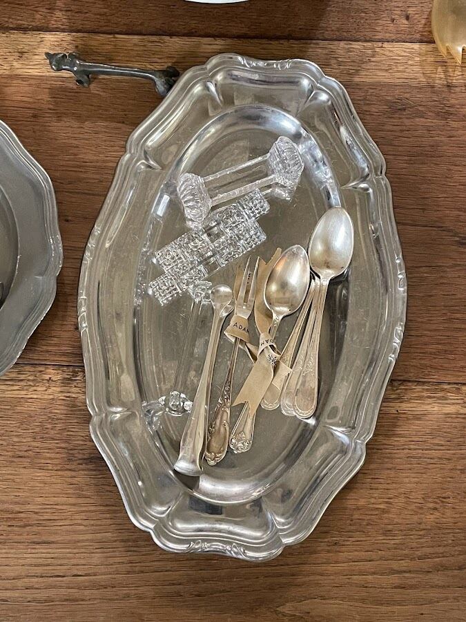 フランスから入荷したビンテージの花リムオーバル型のステンレス皿です。