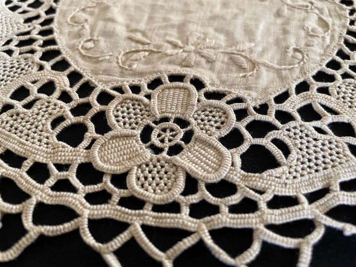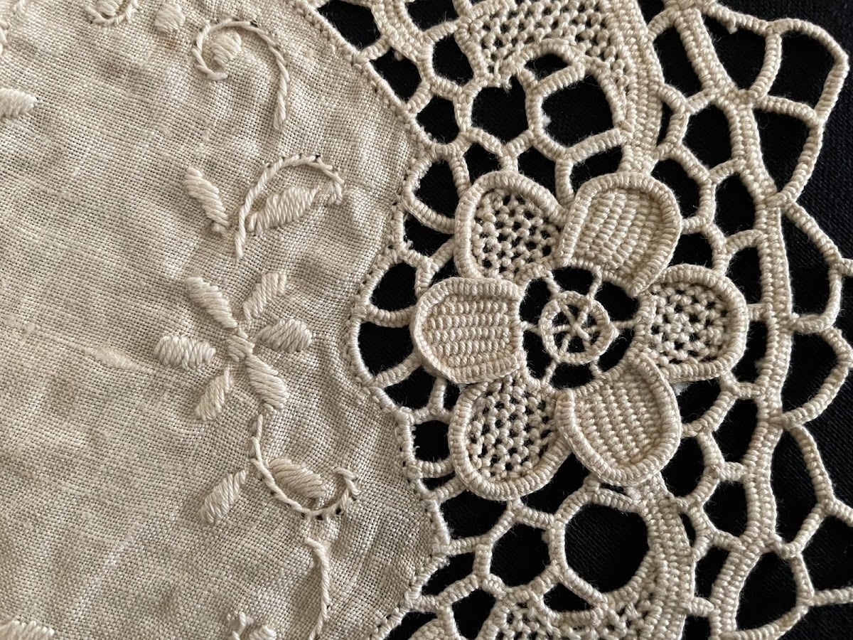 麻布の周囲を囲むのは、1本の糸を縫い針だけでかがって作る透かし穴かがりのニードルポイントレース。