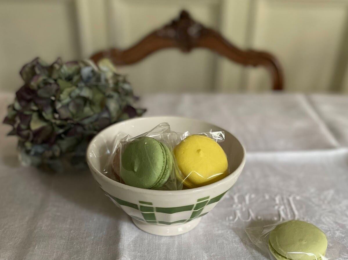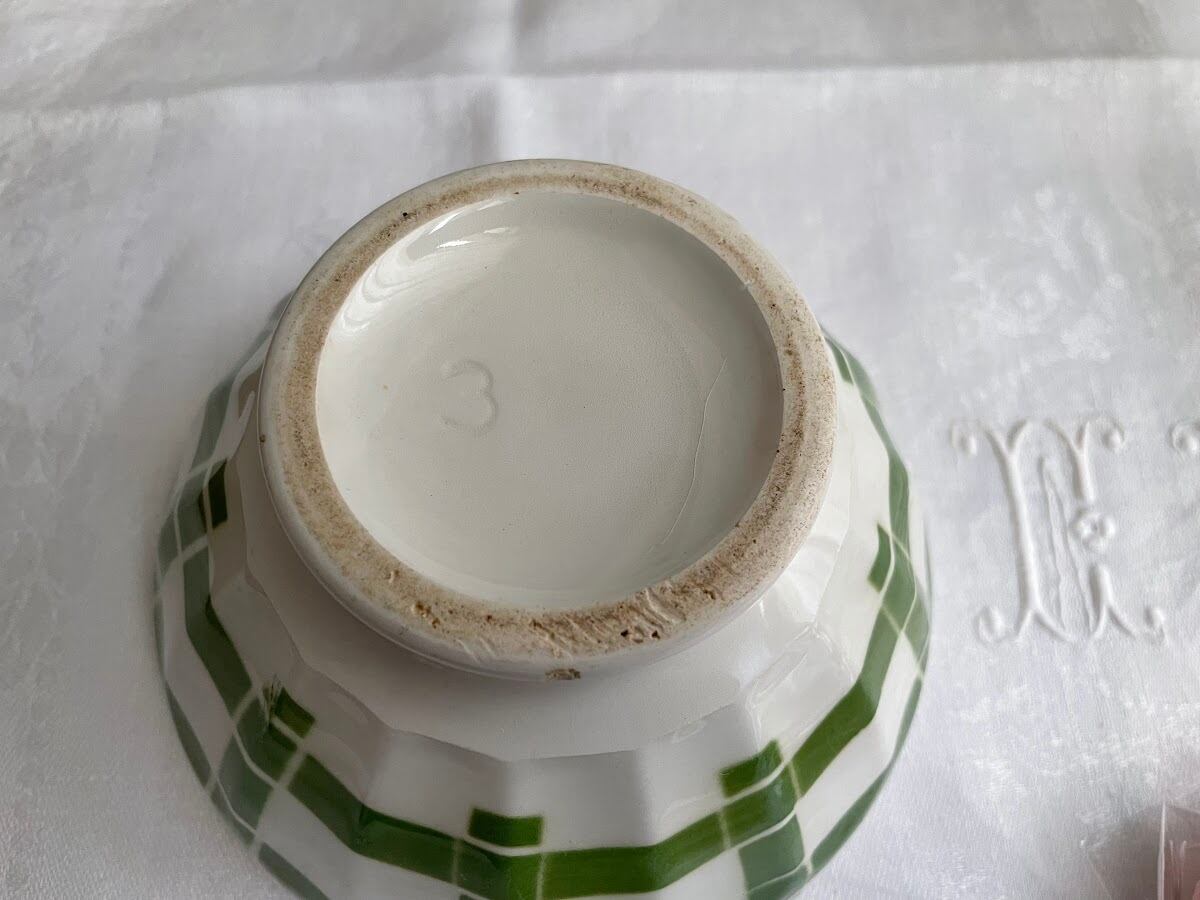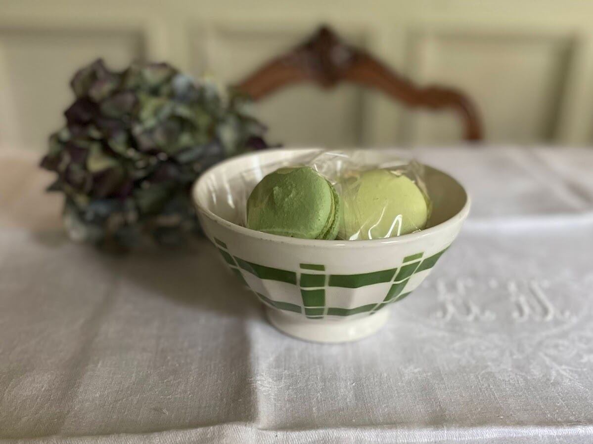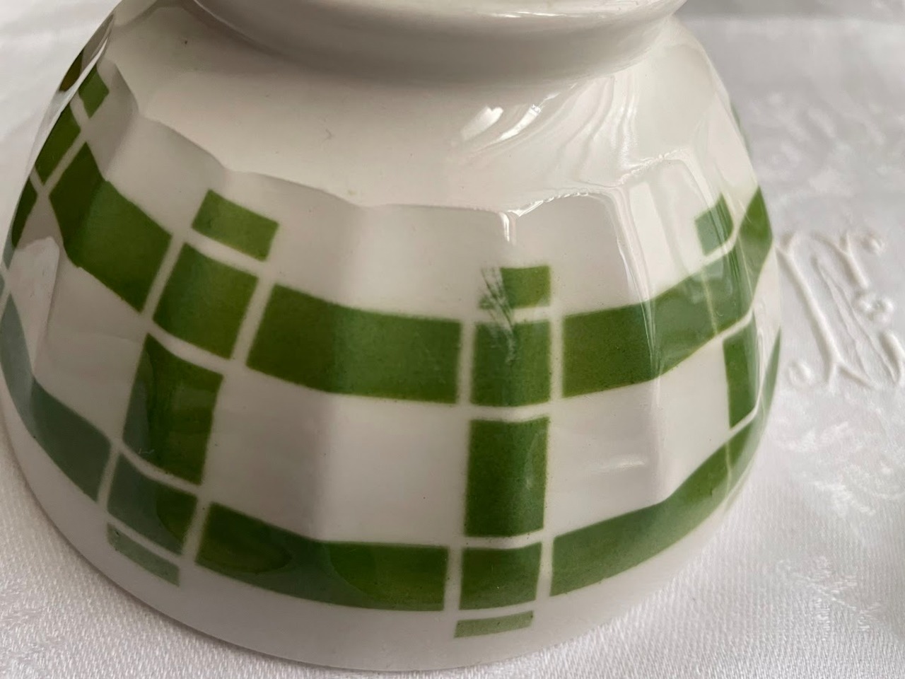 フランスのブロカントから届いた、バンブーのように見えるグリーンの格子柄がとてもおしゃれなカフェオレボウルです。
