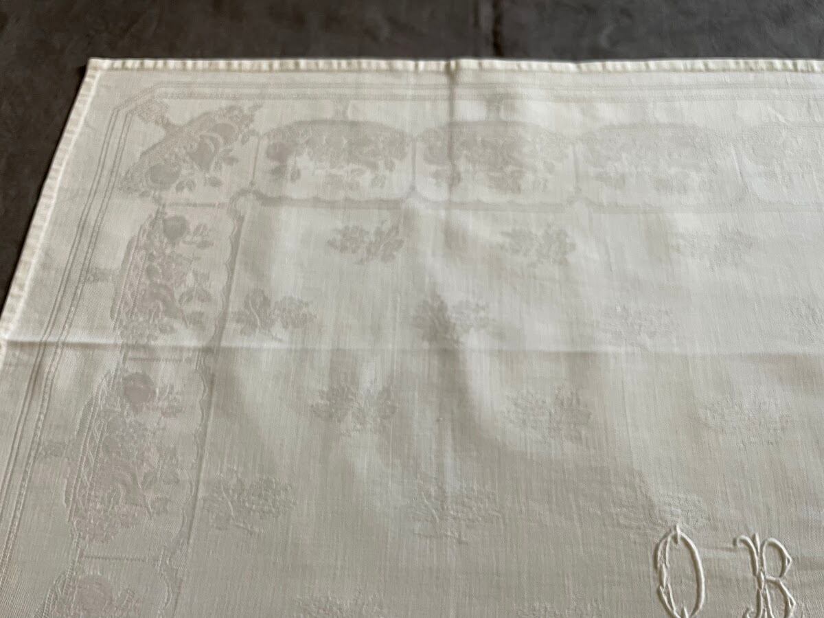 手刺繡モノグラム入り ダマスク織り リネン 白いセルヴィエット 【D-44】