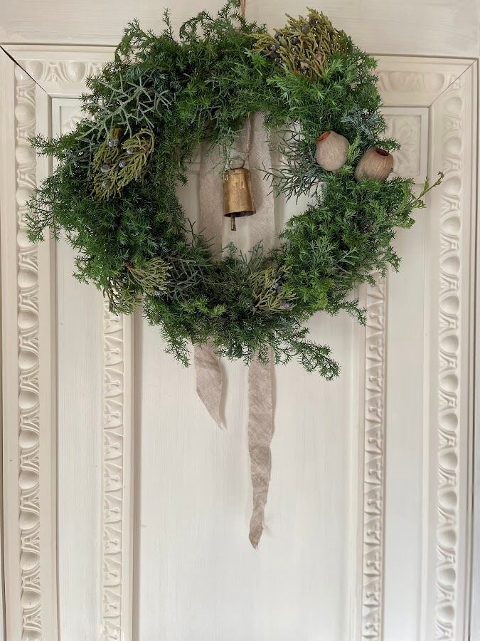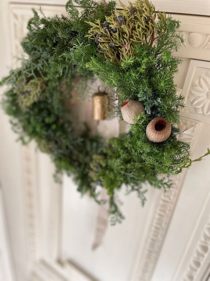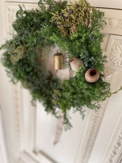4種類の針葉樹をたっぷり使ってアンティークカラーのベルガムナッツとブルーグレーのジュニパーベリーの実をアクセントにし、落ち着いた色味のシックなノエルリースに仕上げています。