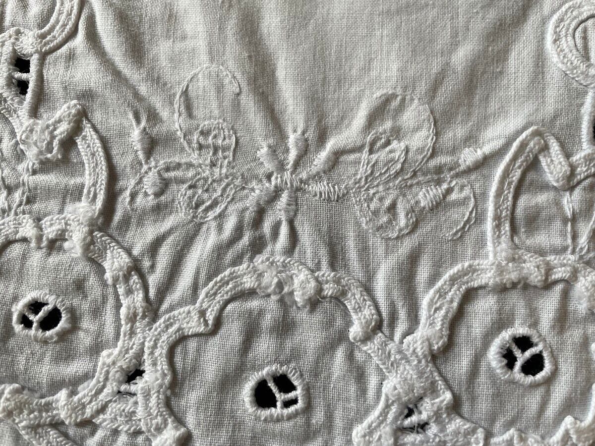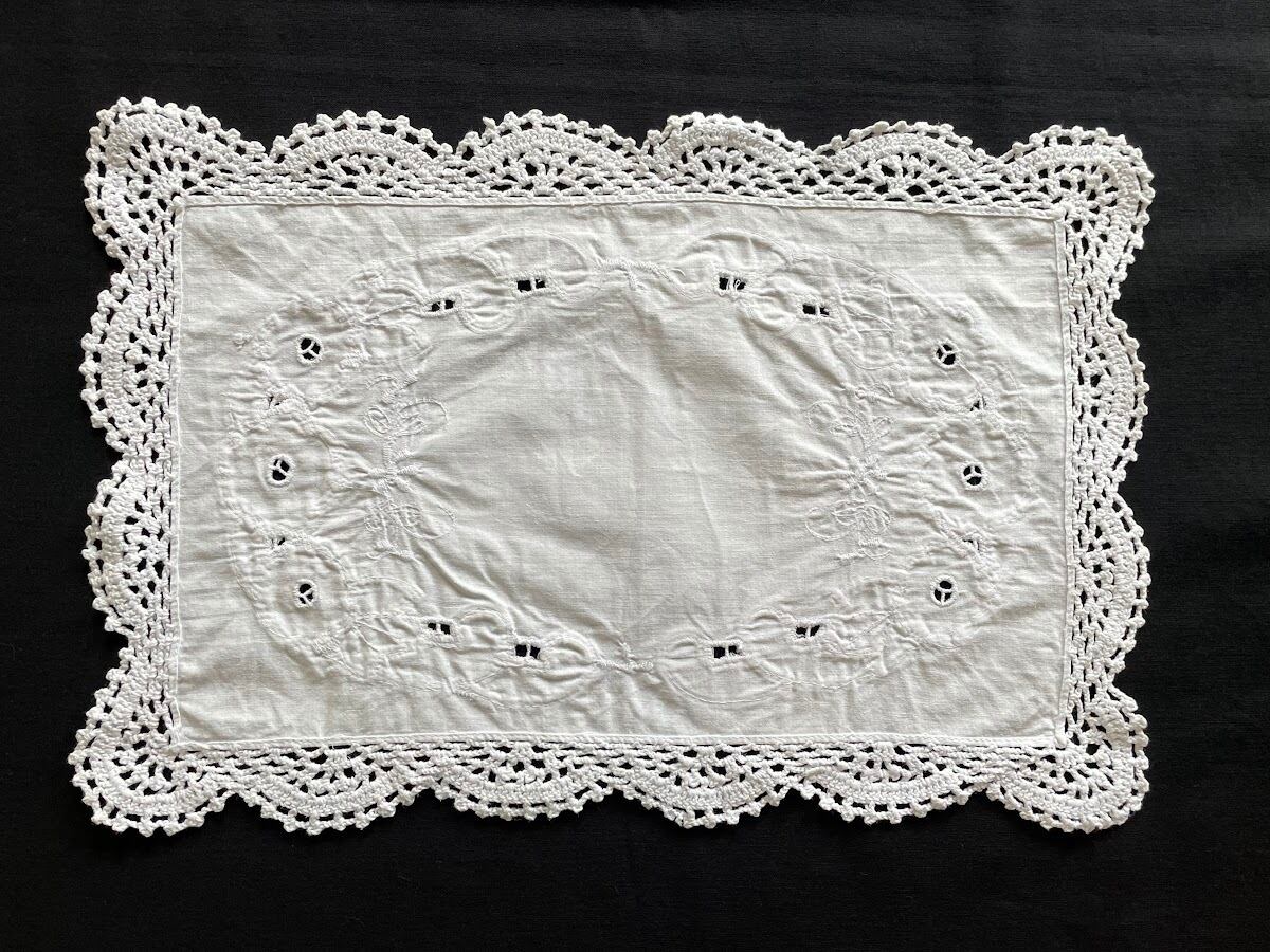 白いコットン生地に花のガーランド模様と周囲のクロシェレースが華やかでかわいいテーブルセンターです。