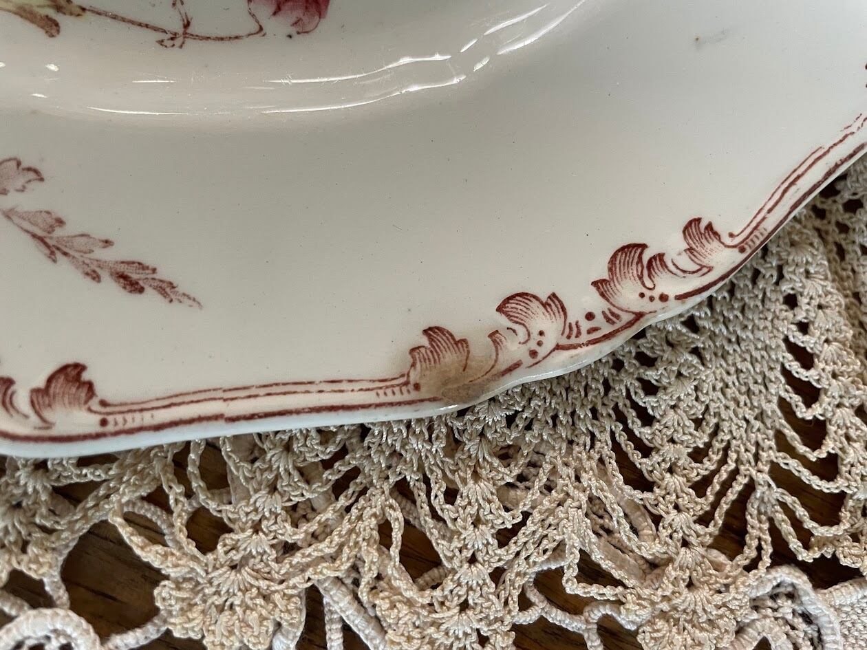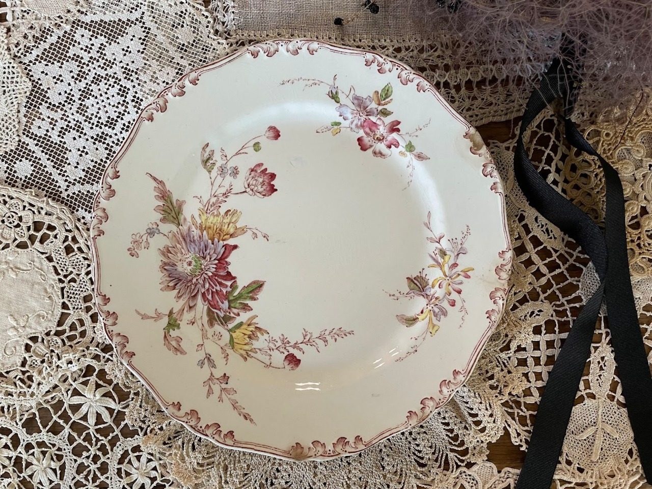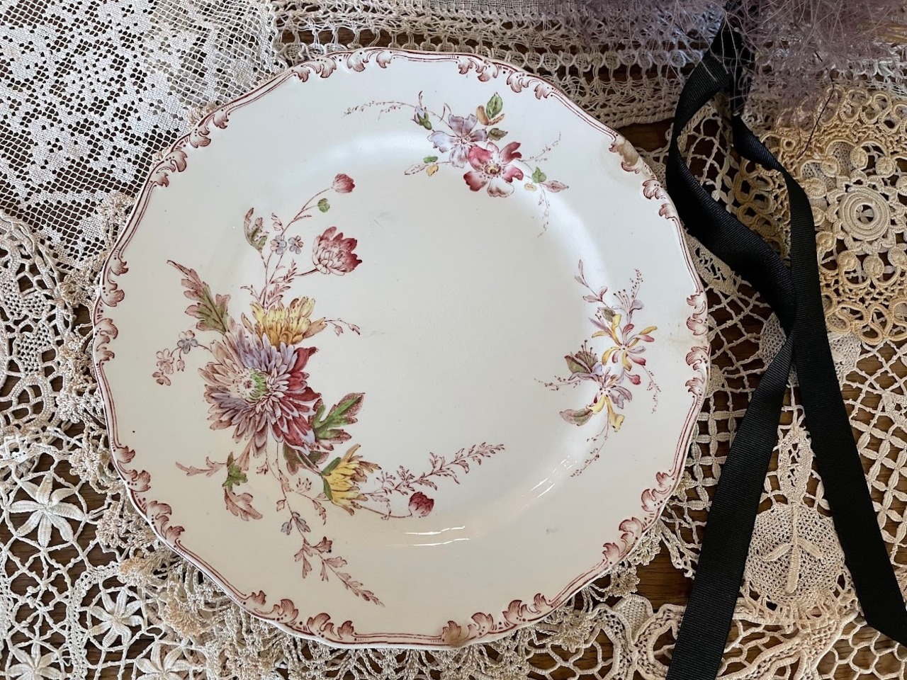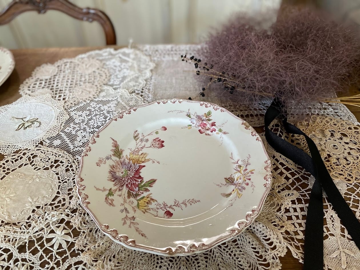 エクリュカラーの陶肌に描かれた花々と、深い赤で描かれた縁のロカイユ模様がナチュラルなエレガントさを醸し出しているとても美しいプレートです。