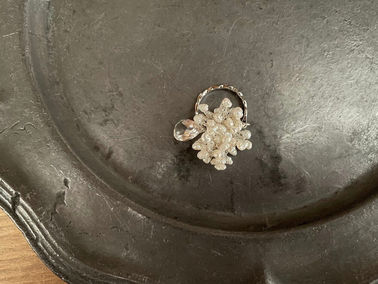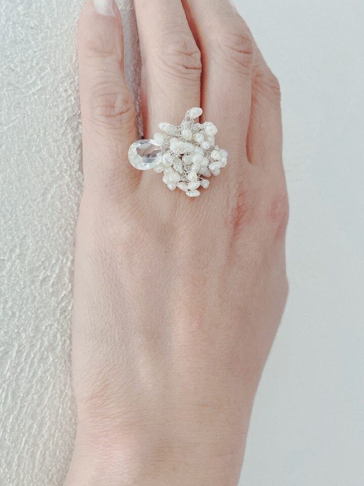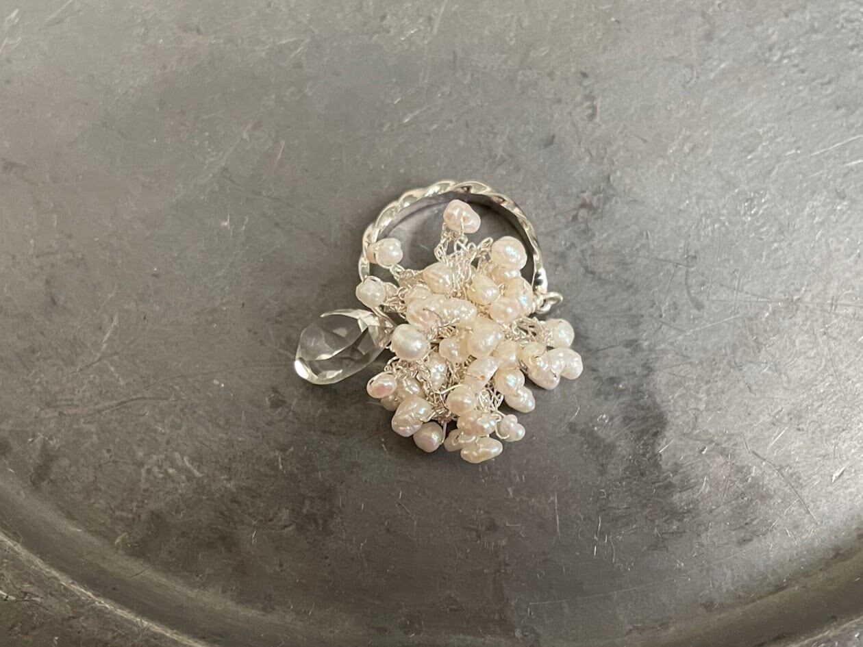 ひとつひとつ形の違う自然からの恵みの淡水パールを銀色の糸で編み、カットが美しく輝く天然石のクリスタルをアクセントに添えてリングに仕立てました。