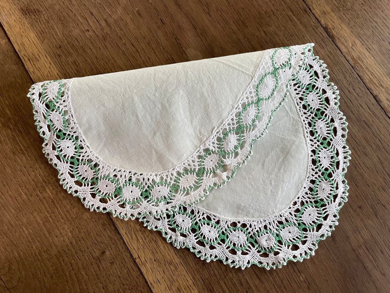 麻生地の薄いグリーンと、ボビンレースに入ったグリーンが爽やかで印象的な一枚。