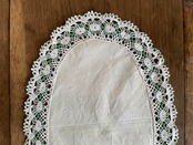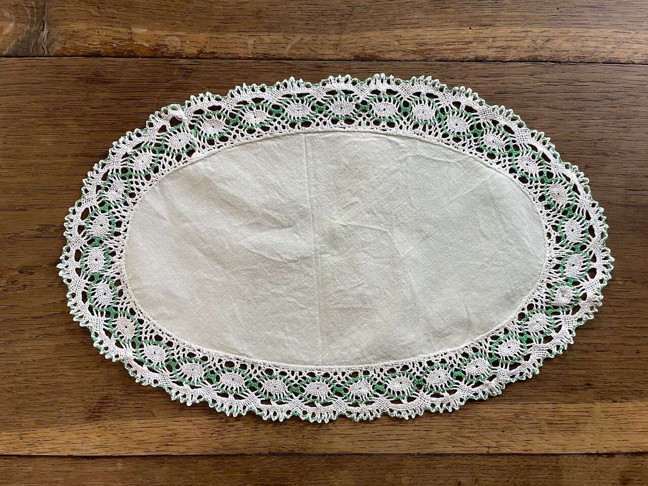 シャリ感のある薄いグリーンの麻生地の周囲にボビンレースが施されたオーバルのドイリーです。