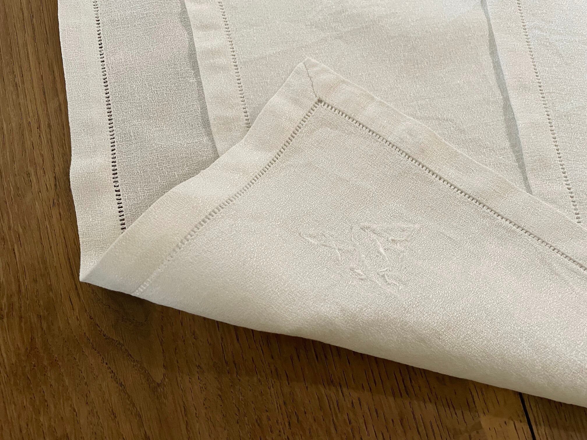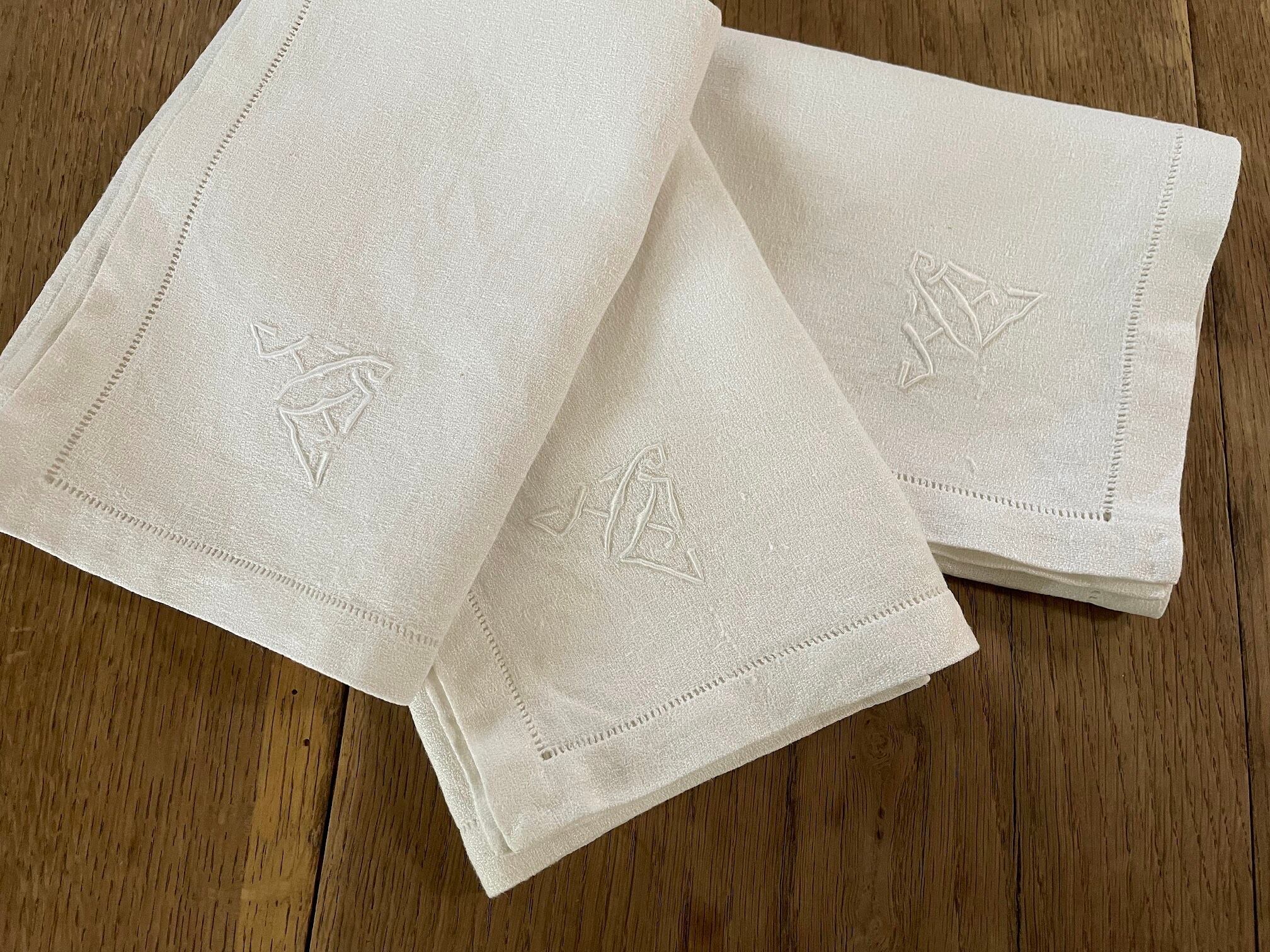 【3枚セット】アンティーク モノグラムとドロンワークのテーブルナプキン フランス 【D-194】